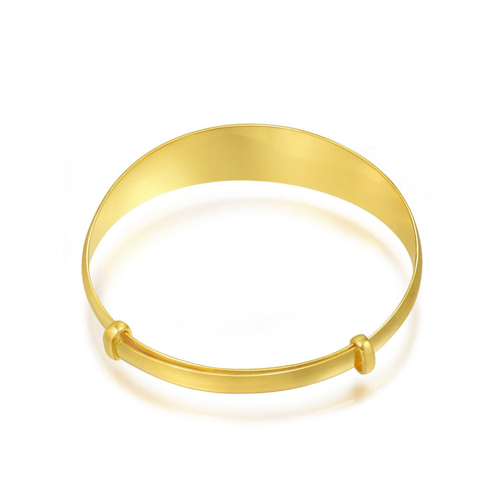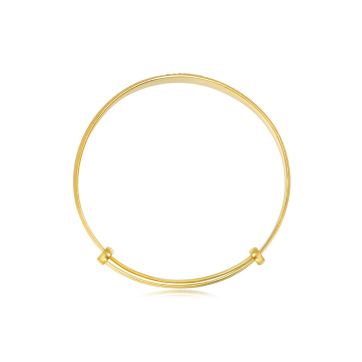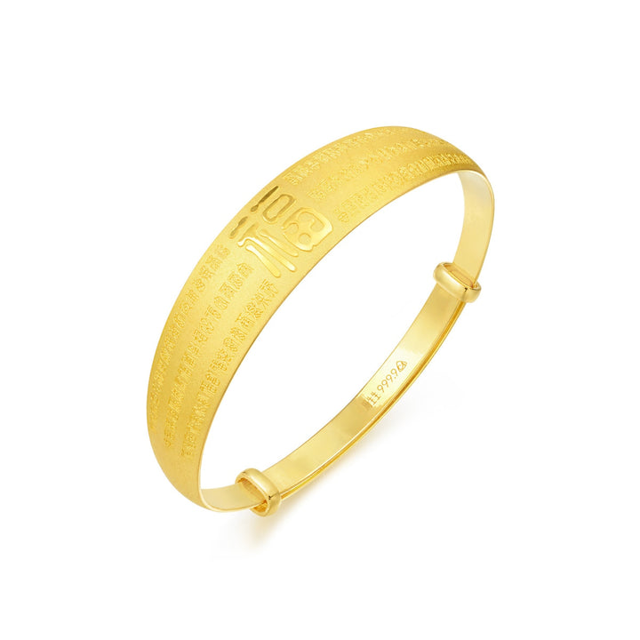 This Love Symbol 999.9 Gold Bangle by Chow Sang Sang is engraved with Chinese calligraphic expressions of blessings, famously known as the “Hundred Blessings.” The intricate artistry of this design draws divine grace and immense blessings to its wearer, creating a timeless and elegant accessory.