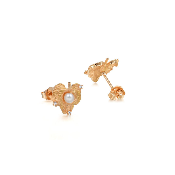 These Voyage 18K Rose Gold Freshwater Pearl Earrings by Chow Sang Sang are inspired by grape leaves, symbolizing abundance and liberty. Adorned with translucent freshwater pearls and accented with diamonds, these earrings offer an elegant charm for everyday wear.