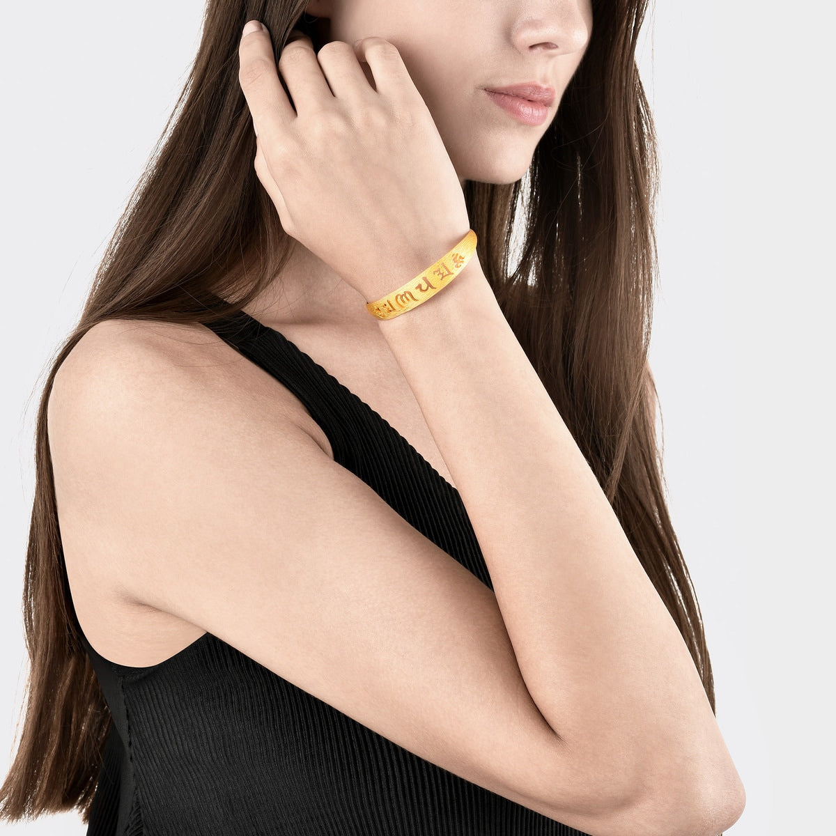 This Om Mani Padme Hum 999.9 Gold Bangle by Chow Sang Sang celebrates the rich heritage of Mahayana Buddhism. The bangle features the six characters of the mantra recited in the quest for enlightenment, blending the elegance of modern art with deep spiritual meaning.