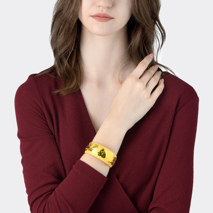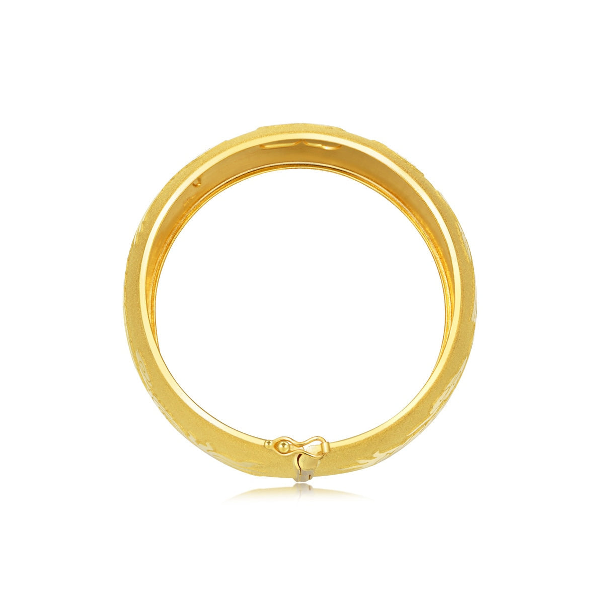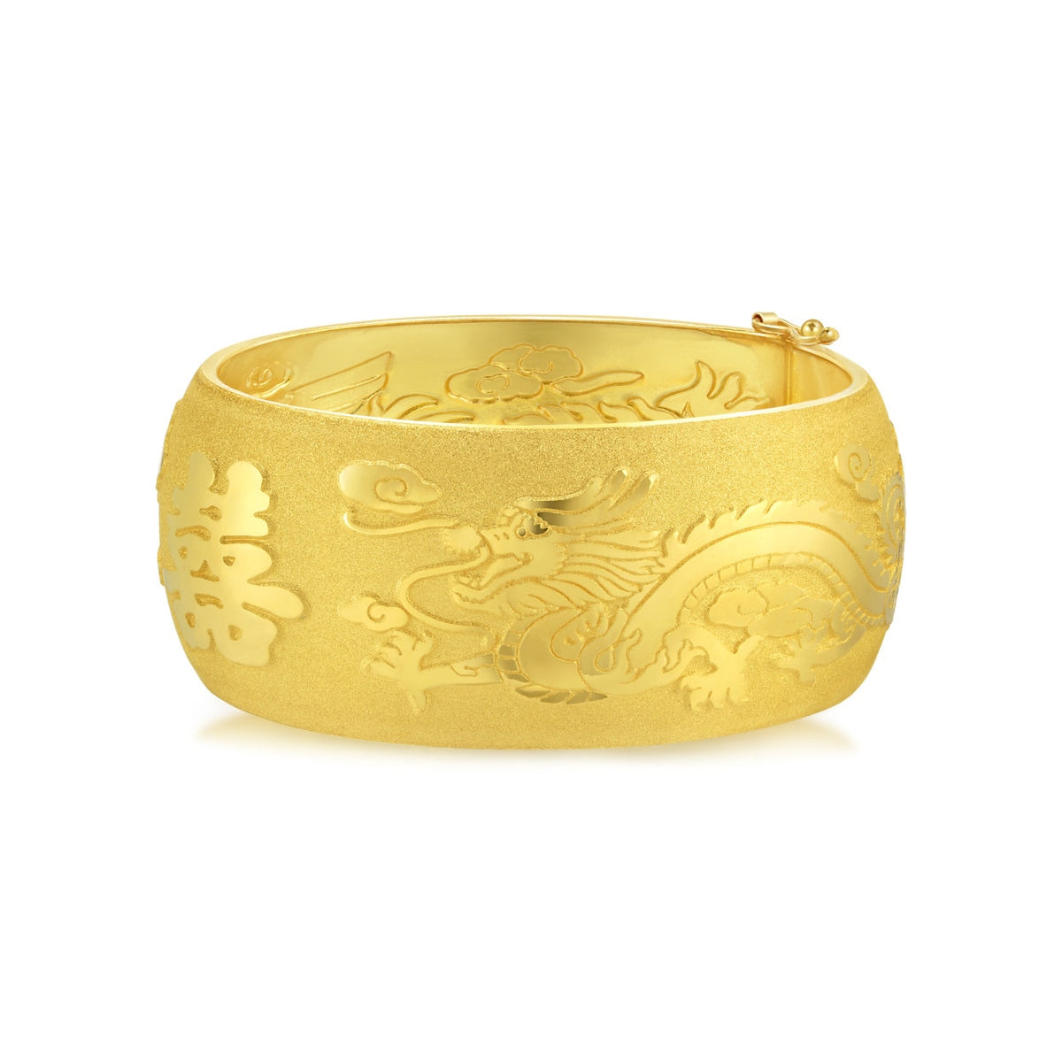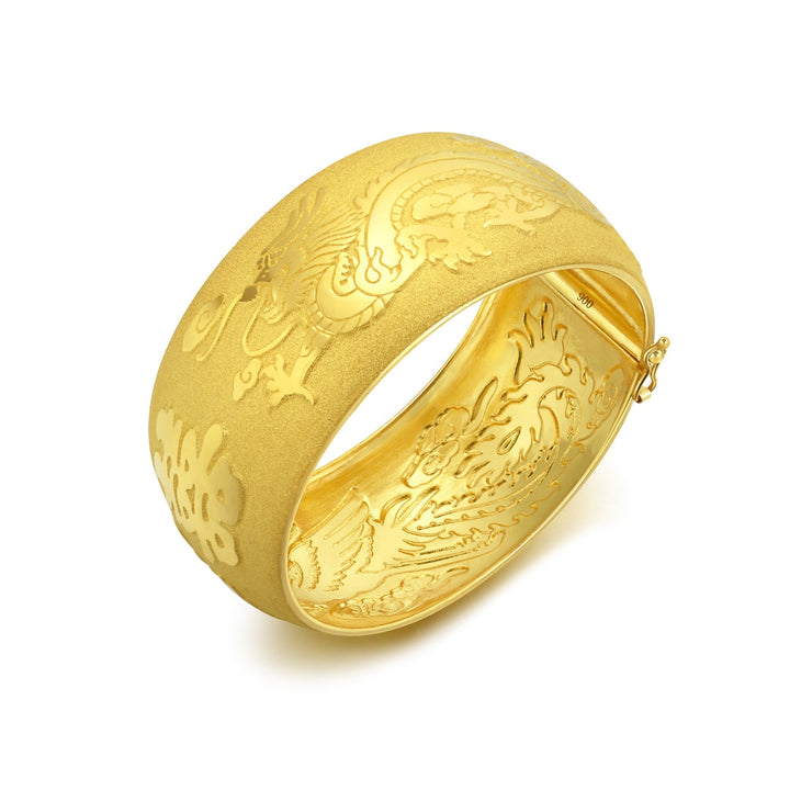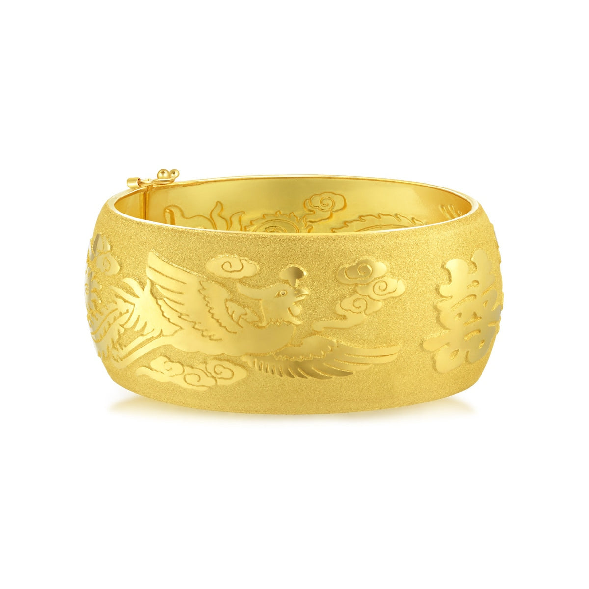 This Dragon & Phoenix 999.9 Gold Bangle by Chow Sang Sang exudes the festive elegance of Chinese wedding traditions. The bangle is stylized with 3-dimensional embossed pure gold, embodying the opulence and auspiciousness of this cherished cultural symbol.