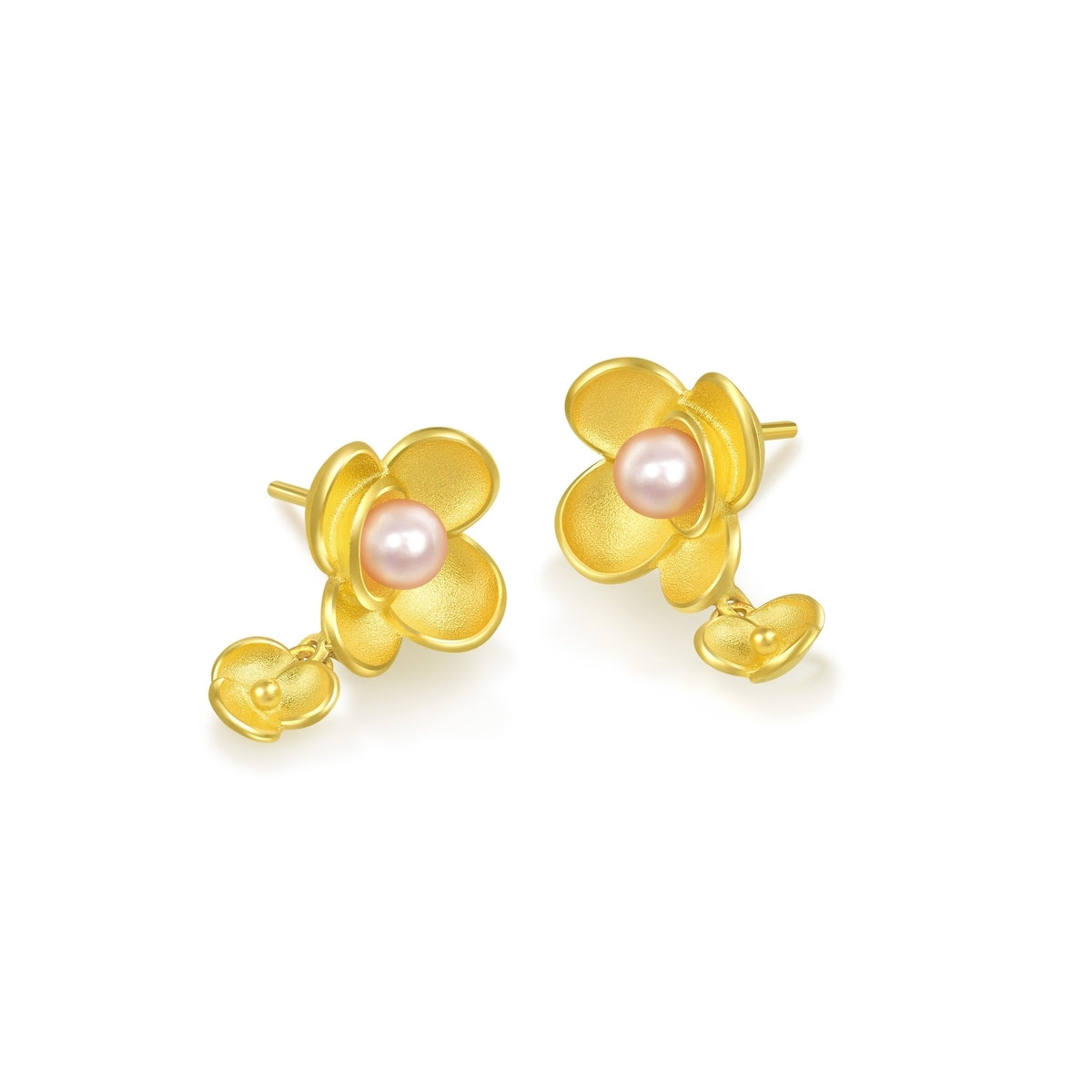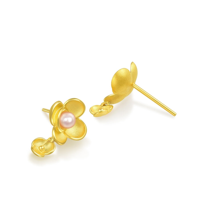 Handcrafted in 999.9 gold, weighing approximately 0.104 tael (~3.893g). The earrings feature lustrous pearls and a Camellia-inspired motif.