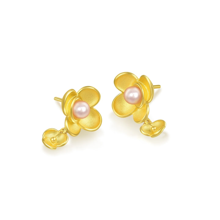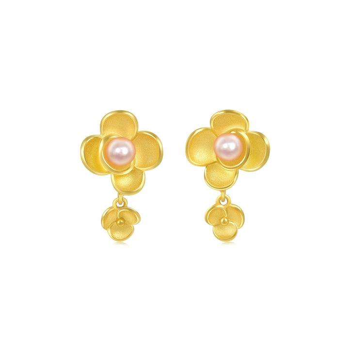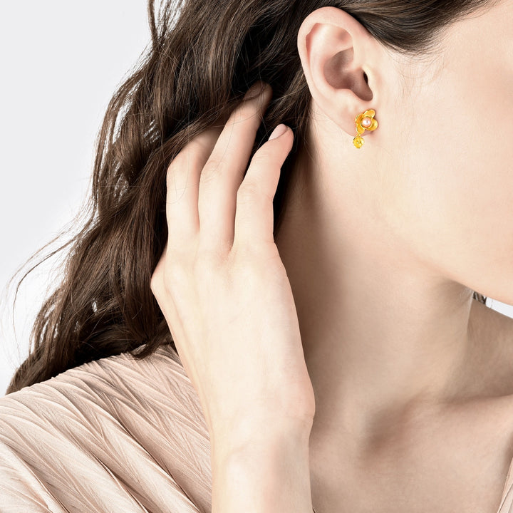 These Floral 999.9 Gold Earrings by Chow Sang Sang are a beautiful tribute to the Camellia flower, symbolizing 'ideal love' in floriography. Each earring features a pearl-set gold design, delivering a message of profound blessing and timeless elegance.