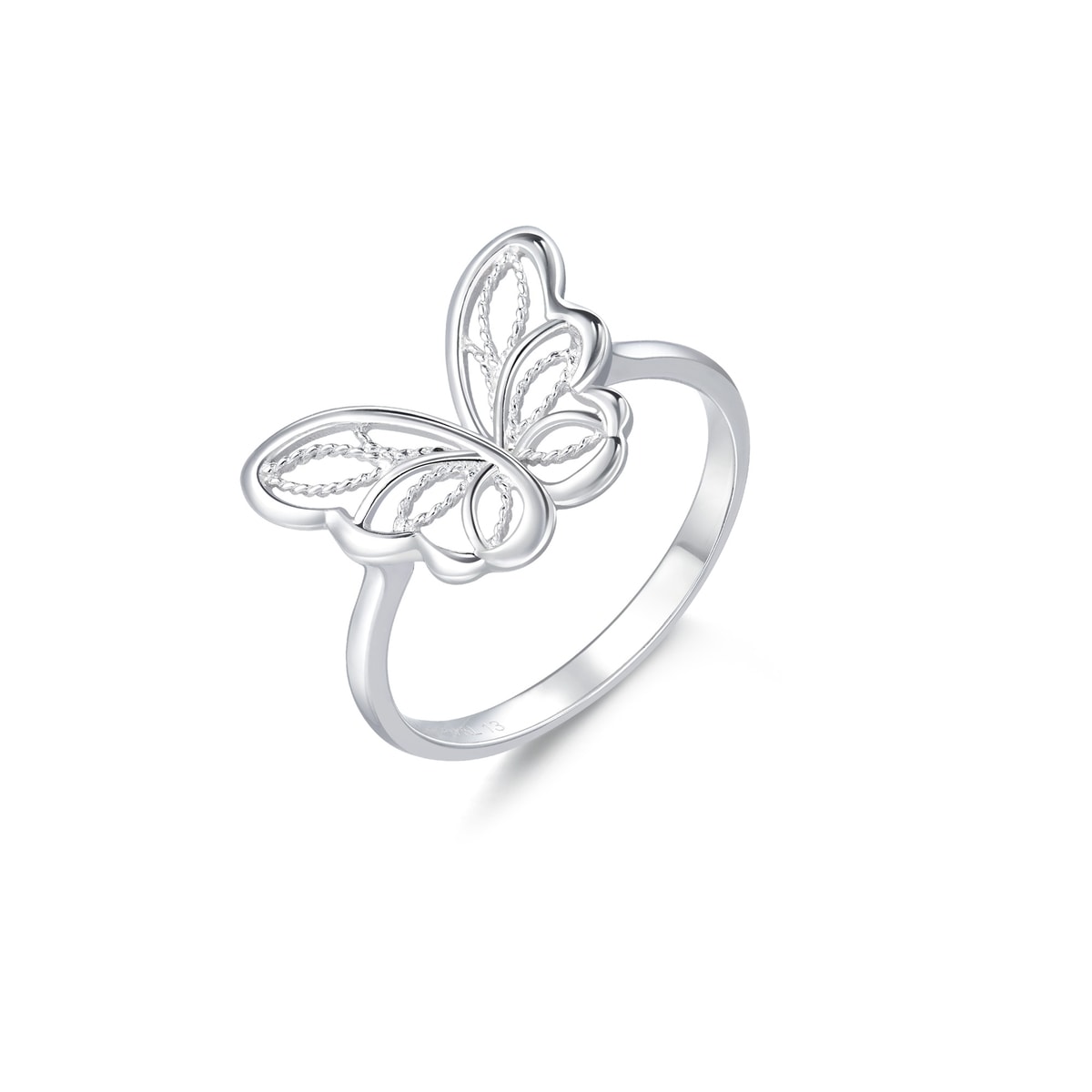 This 950 Platinum Butterfly Ring by Chow Sang Sang is inspired by the delicate filigree craftsmanship of Orissa, India. The intricate butterfly tracery evokes the quintessential beauty of refined femininity, making it a timeless piece of elegance.