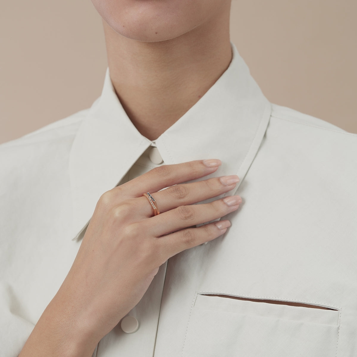 This M 18K Red & Black Gold Black Diamond Ring by Chow Sang Sang combines the boldness of black diamonds with a unique 18K rose and black gold setting. The treated black diamonds add a dramatic flair, making this ring a striking statement piece perfect for mixing and stacking.