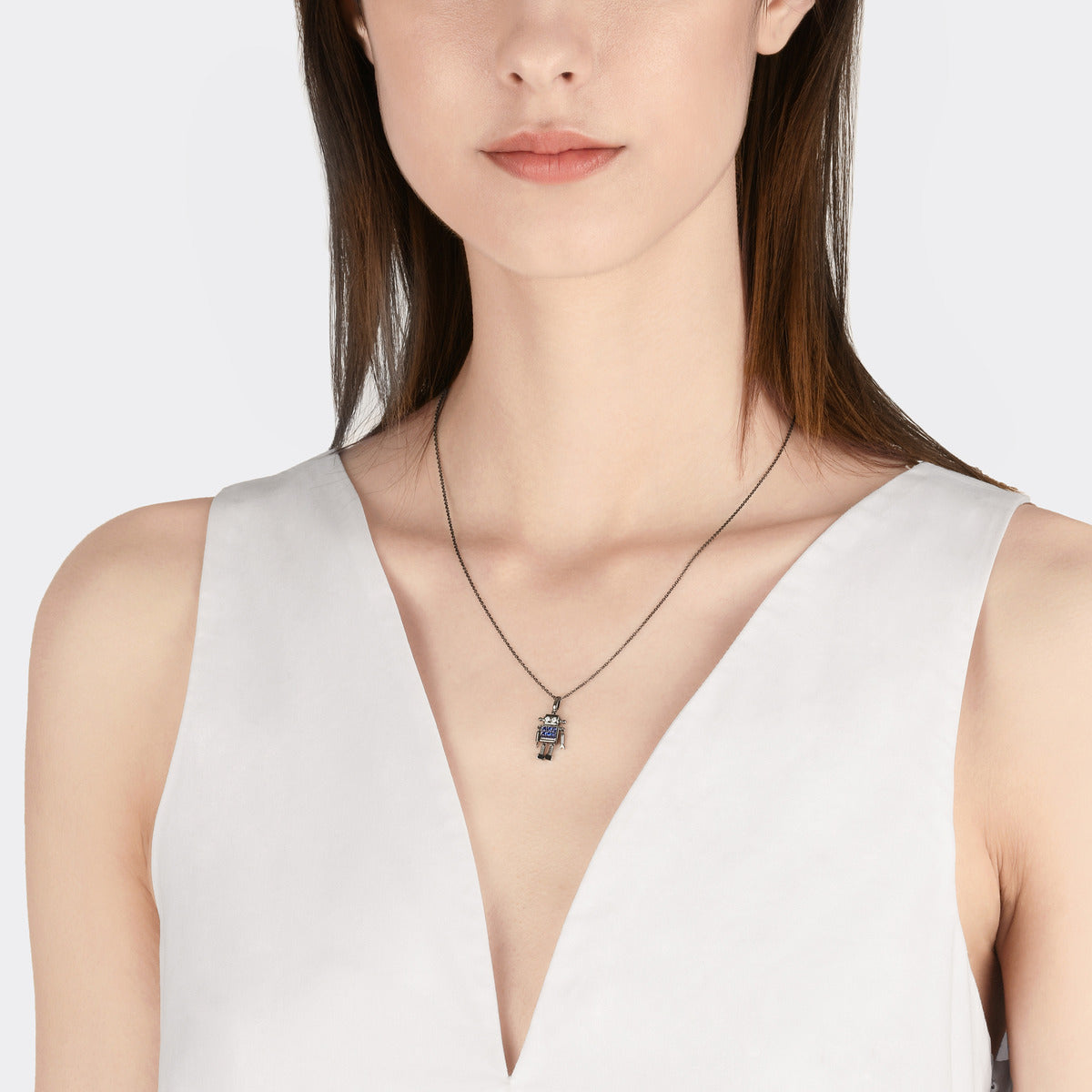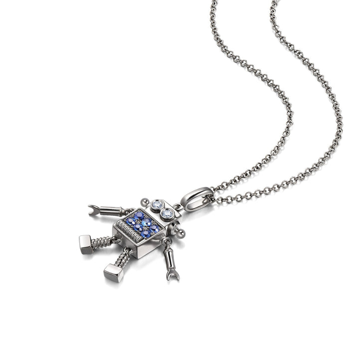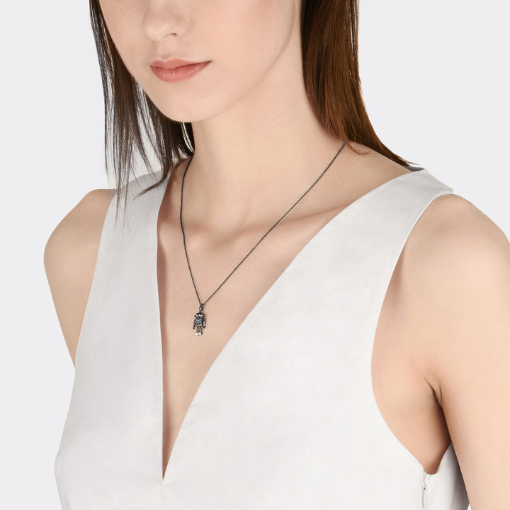 This 18K Black Gold Sapphire Necklace by Chow Sang Sang draws inspiration from the story of robots' immortal love. Crafted in 18K black gold, the pendant features diamond-set eyes and a blue sapphire-adorned chest, symbolizing unwavering love and bringing a touch of romantic charm to your style.