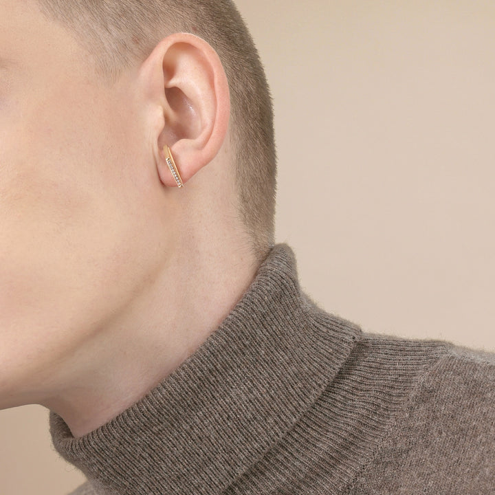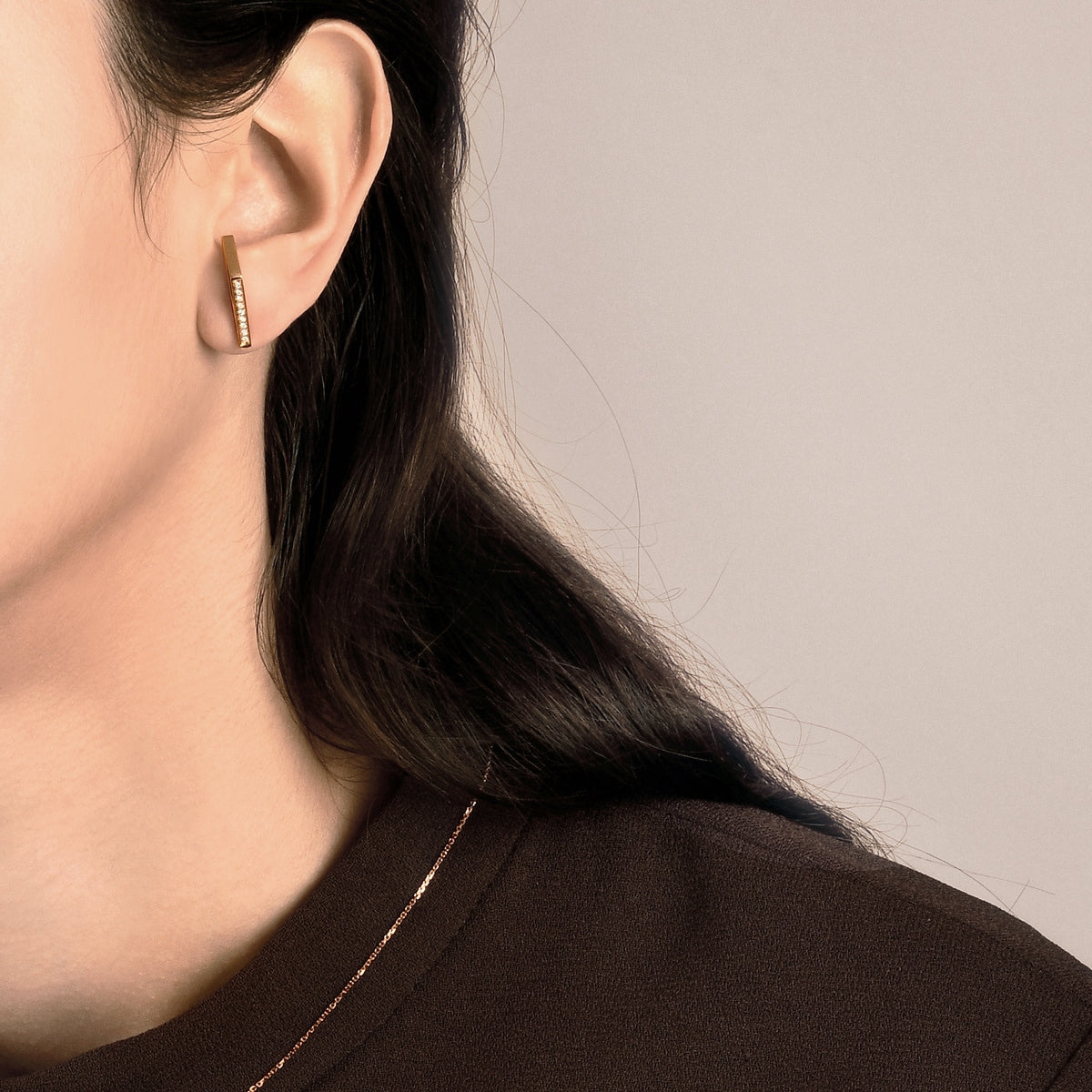 This M 18K Red Gold Diamond Single Earring by Chow Sang Sang deconstructs the brand logo into a sleek and geometric design. Adorned with sparkling diamonds, this single earring is a versatile piece that adds a modern touch of elegance to any look.
