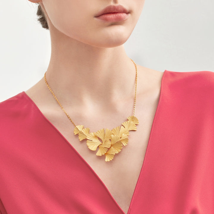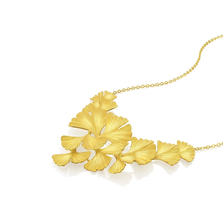 This Floral 999.9 Gold Necklace by Chow Sang Sang features a fan-shaped design adorned with ginkgo leaves, symbolizing longevity and harmony. The symmetrical design conveys a sense of balance and extends wishes for everlasting love, making it a meaningful and elegant piece.
