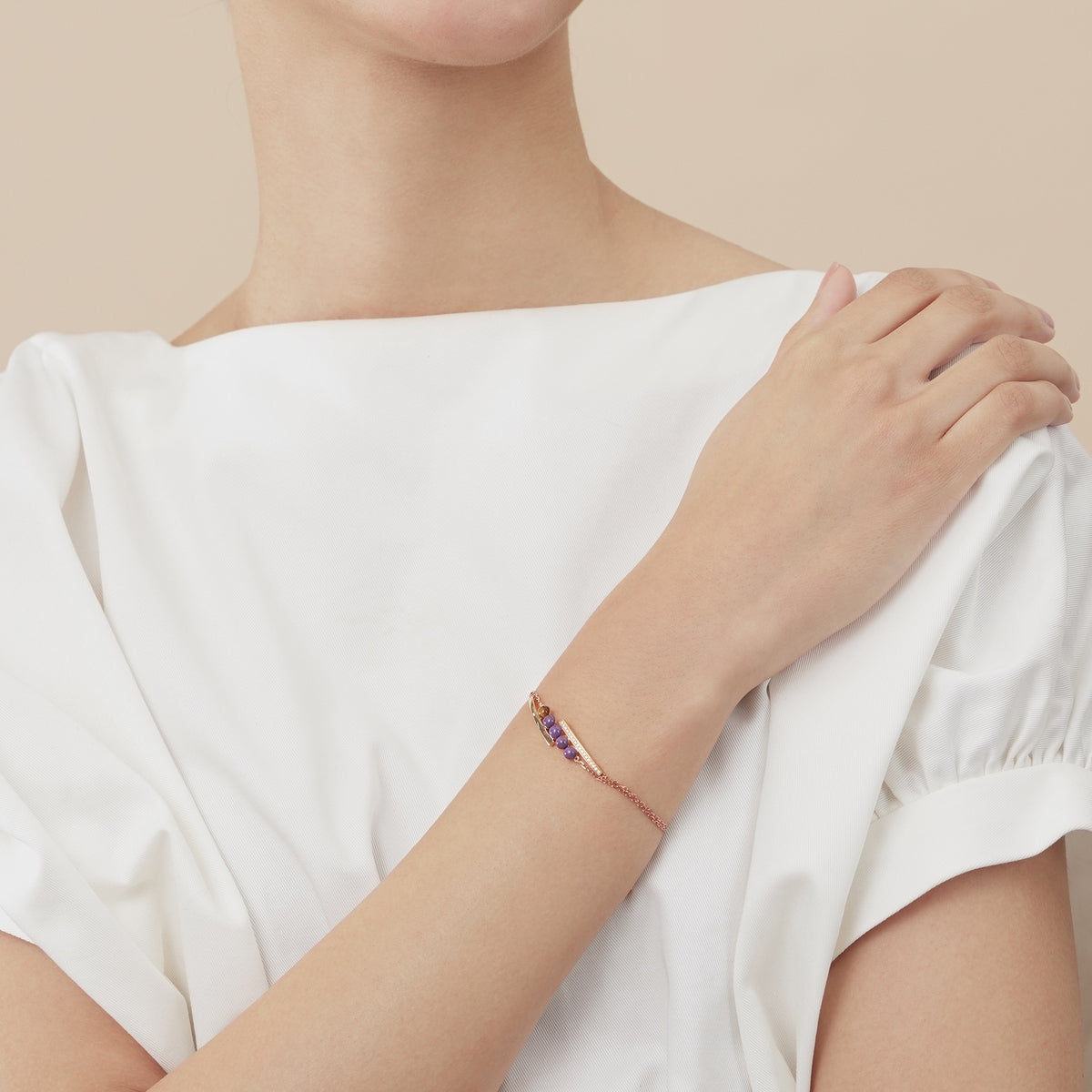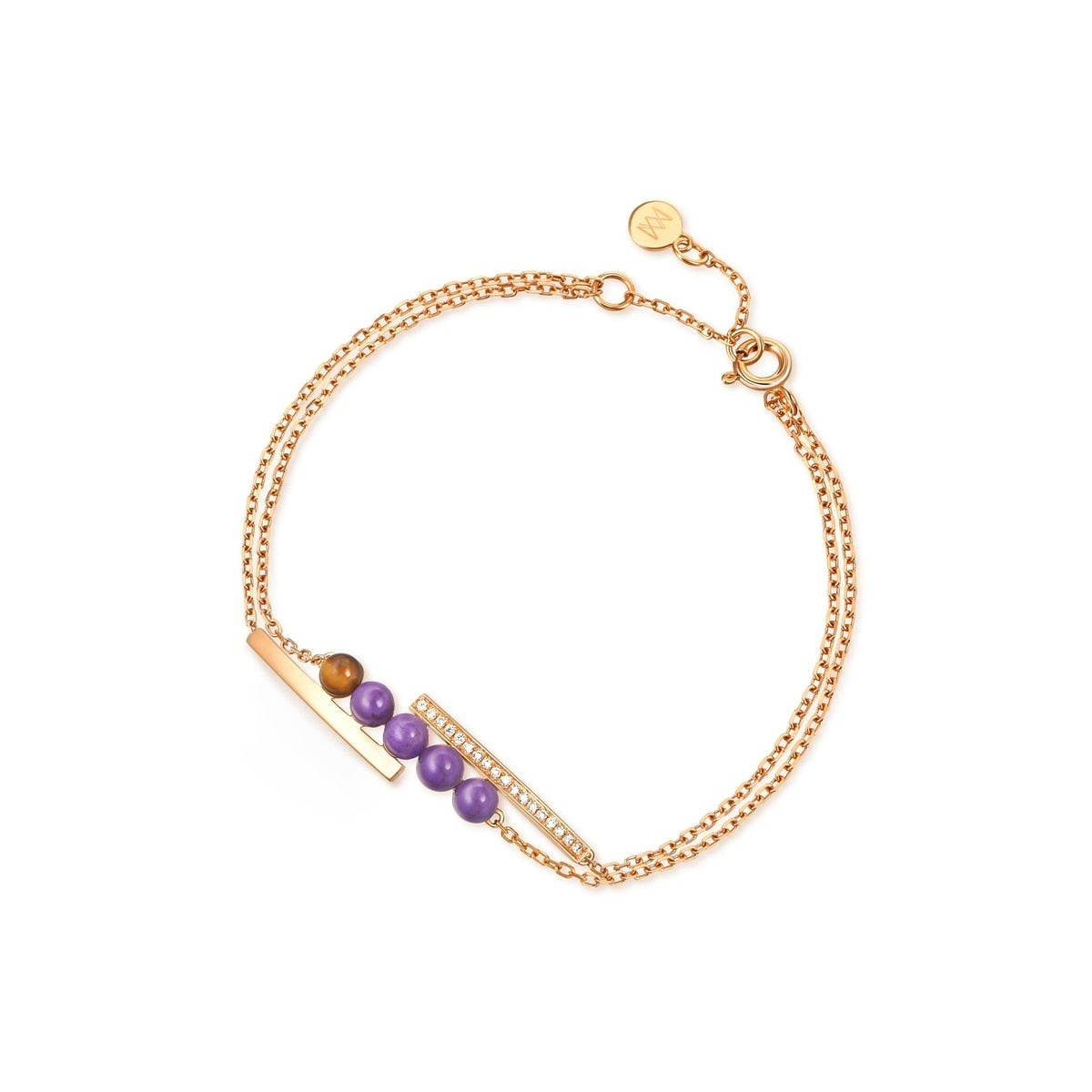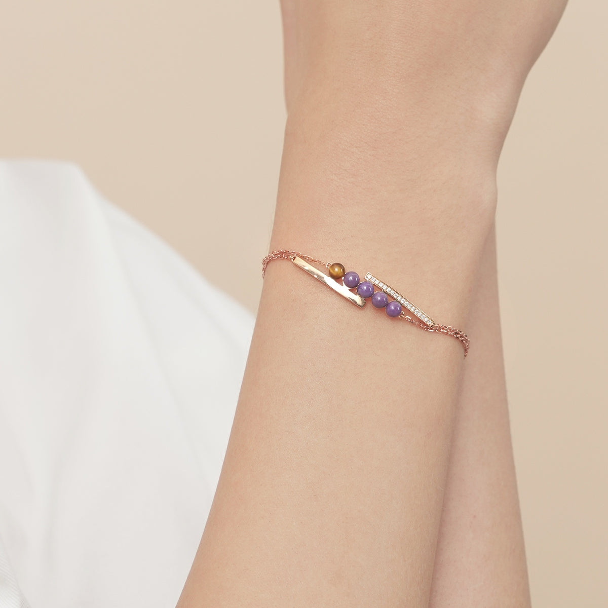This Cosmos 18K Rose Gold Tiger's-eye Bracelet by Chow Sang Sang blends plum jade and tiger's-eye, symbolizing peace and harmony. This bracelet is part of a mix-and-match collection that adds a starry, creative flair to your wardrobe.