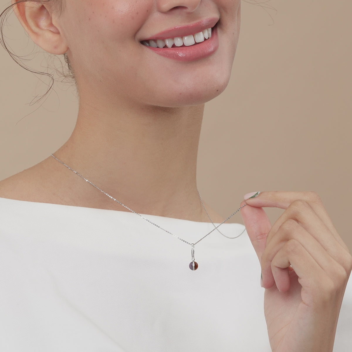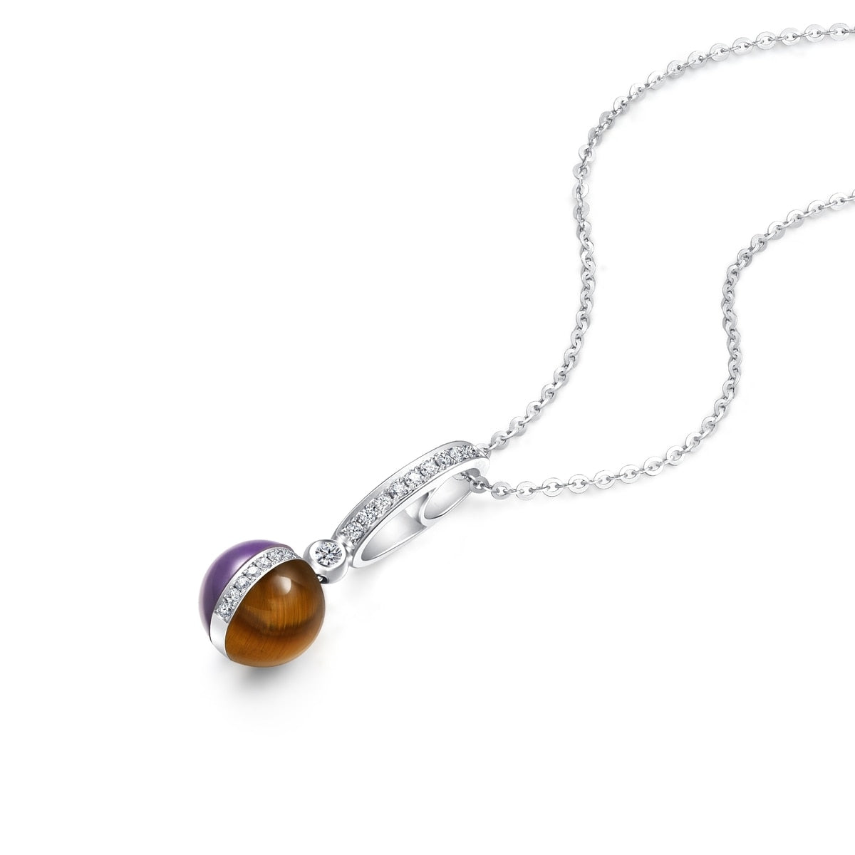 This Cosmos 18K White Gold Tiger's-eye Pendant by Chow Sang Sang is adorned with plum jade and tiger's-eye, symbolizing peace, harmony, courage, and confidence. The pendant is accentuated by diamonds, making it a stunning and versatile piece to mix and match with other semi-precious jewels.