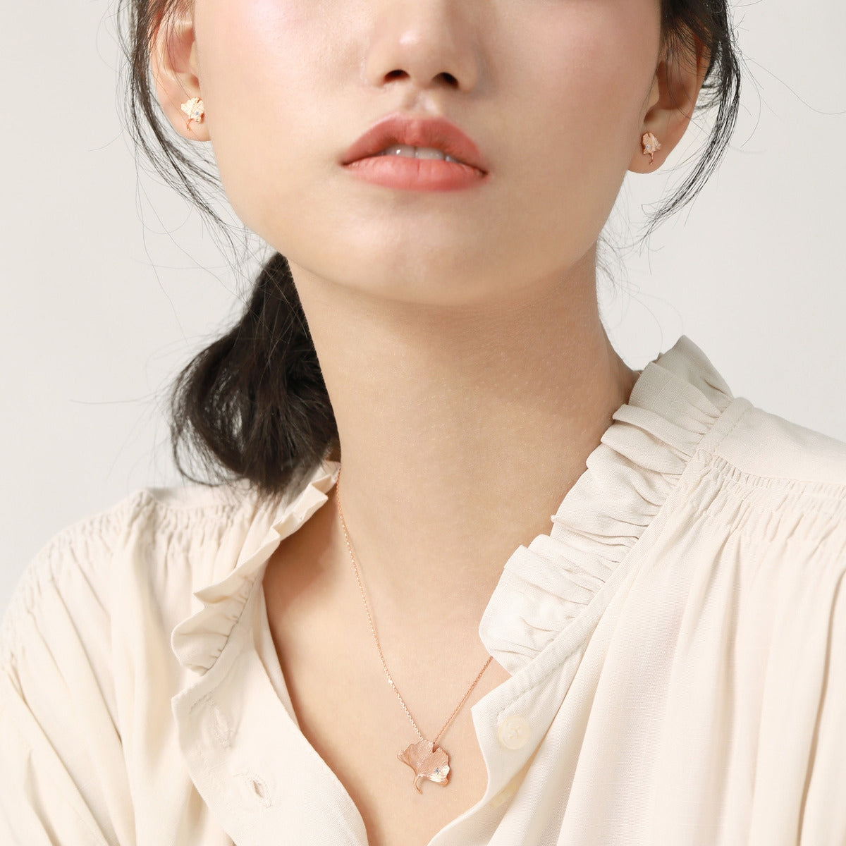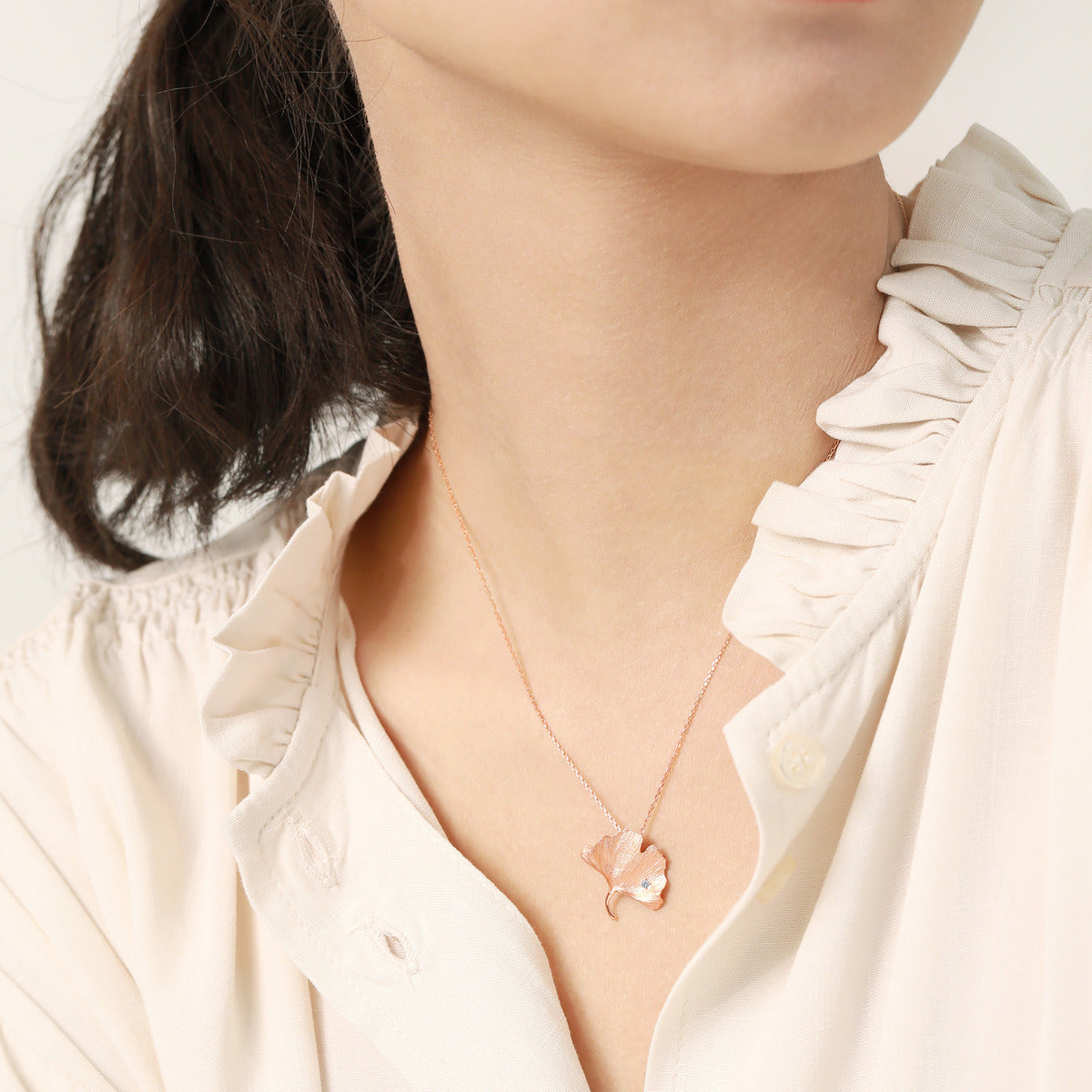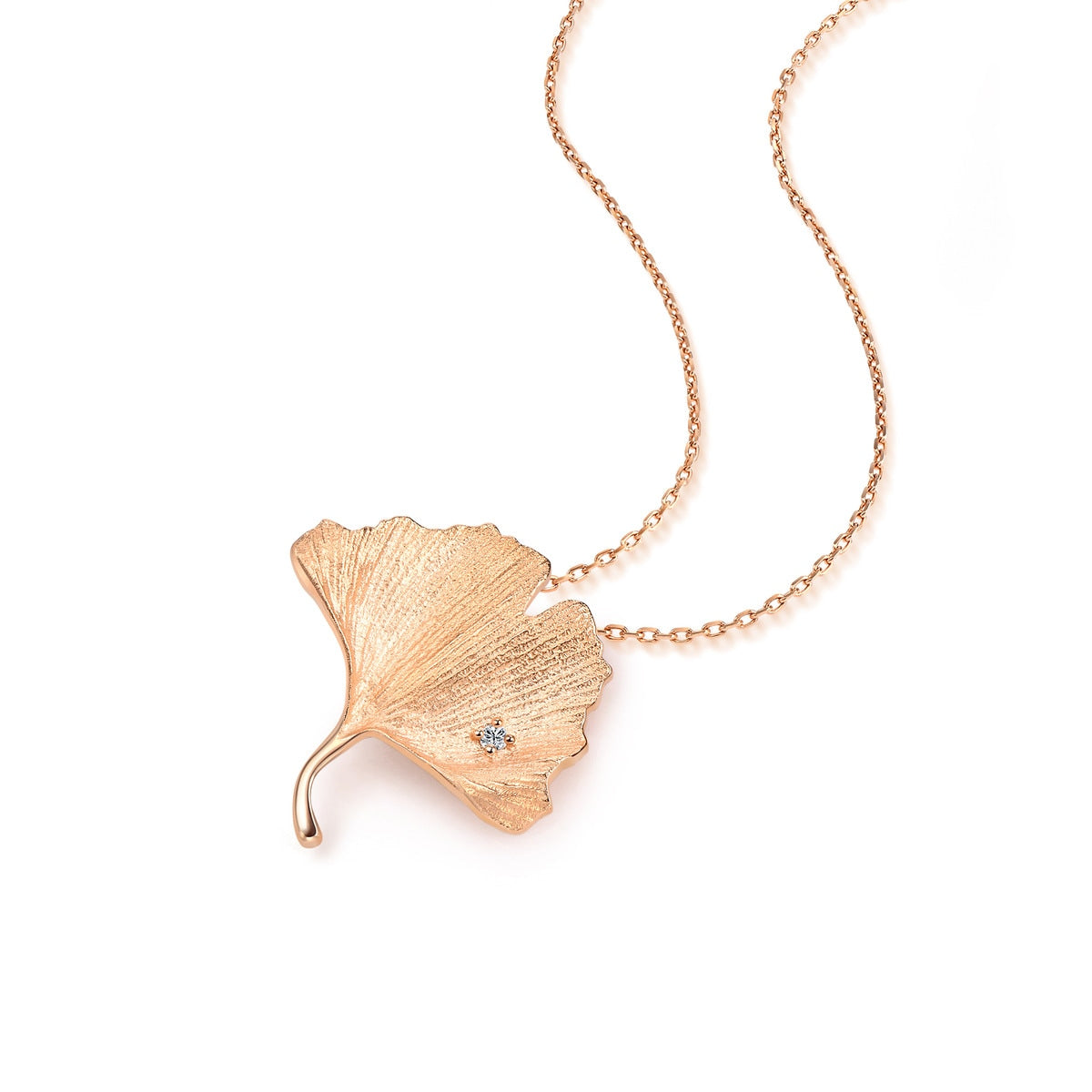 This Ryokou 18K Rose Gold Diamond Necklace by Chow Sang Sang is designed to reflect the joyful moments of a romantic stroll in Japan, under the glow of golden gingko leaves. Embedded with a fiery diamond, this necklace adds elegance to any attire.