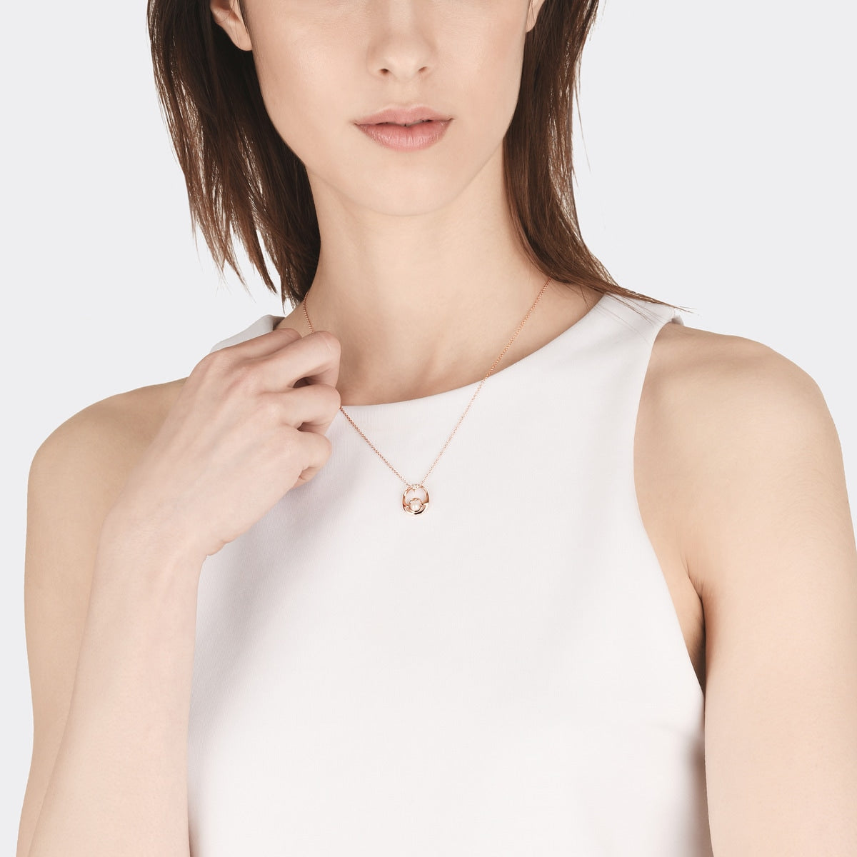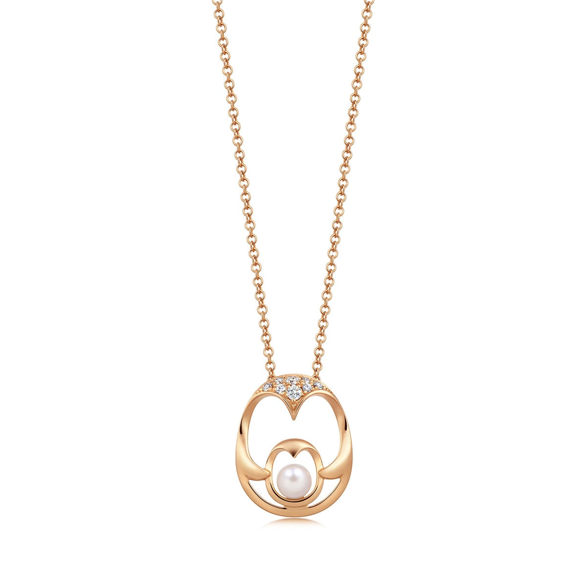 This Petite 18K Rose Gold Akoya Pearl Little Penguin Necklace by Chow Sang Sang features a heartwarming design of a mother penguin cradling her baby. The intricate hollow-carved silhouettes evoke a sense of tenderness and protection, complemented by shimmering diamonds and a lustrous Akoya pearl for a sweet, elegant finish.