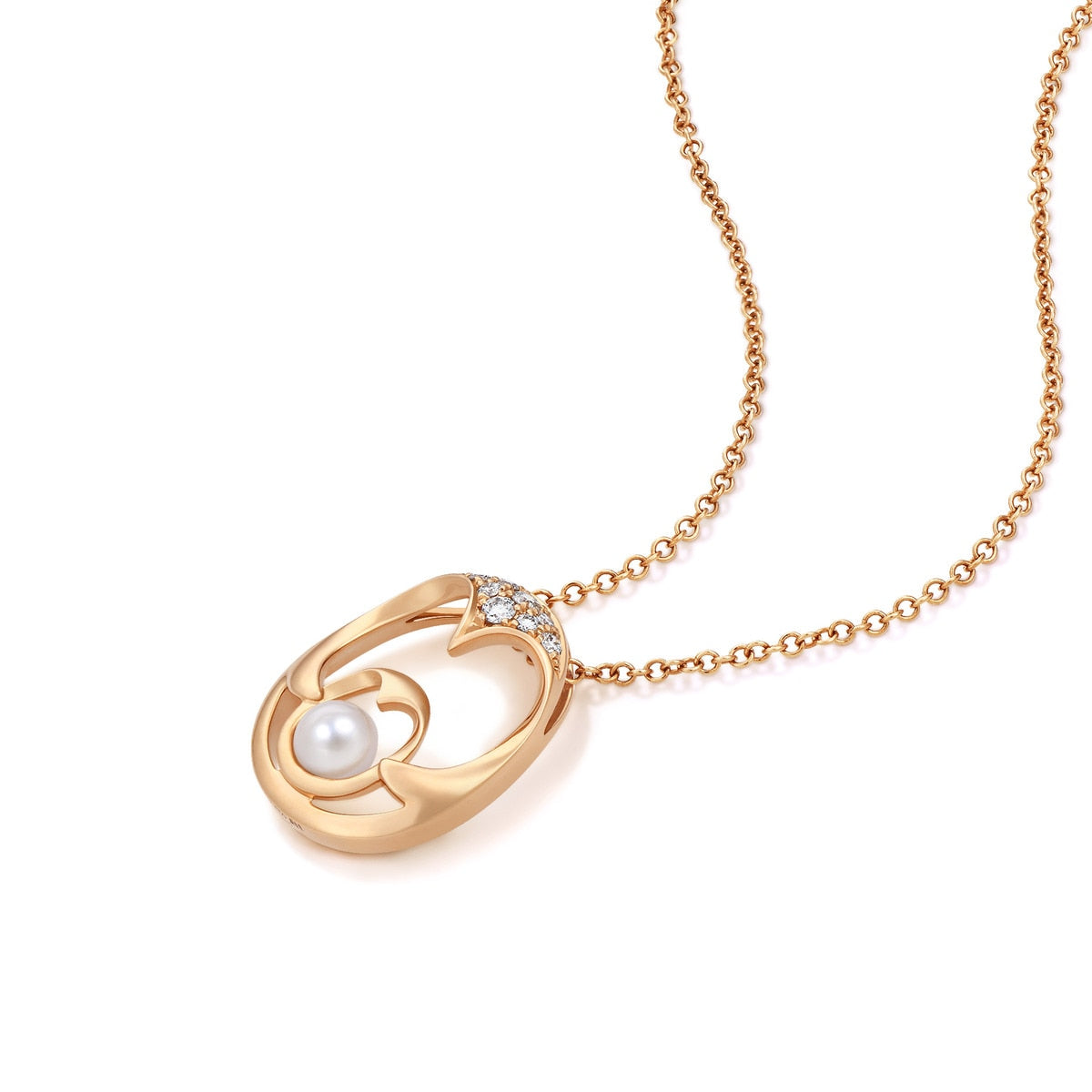 Handcrafted in 18K rose gold, featuring a translucent Akoya pearl, diamonds totaling 0.06ct (SI1-SI2, G-H color grade), weighing approximately 0.073 tael (~2.732g), with a 47cm chain.