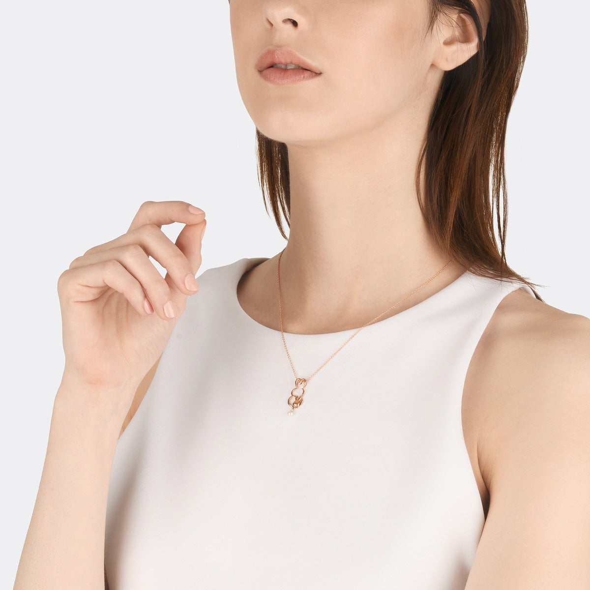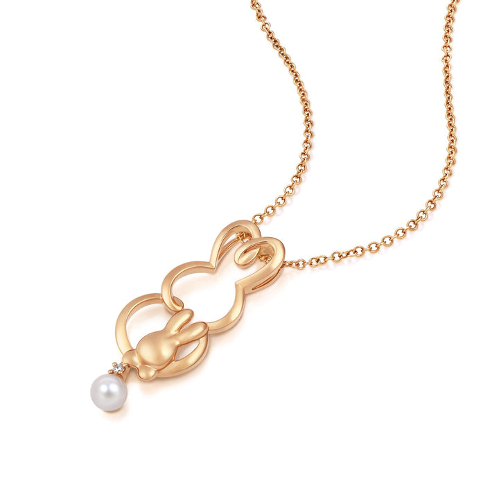 This 18K Rose Gold Akoya Pearl Necklace by Chow Sang Sang features an endearing design of a mother bunny lovingly embracing her baby. The hollow-carved silhouettes evoke warmth and affection, with the piece radiating a delicate charm through its sparkling diamonds and a lustrous Akoya pearl.