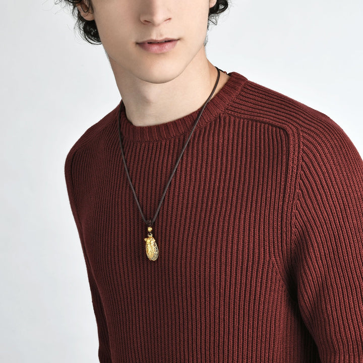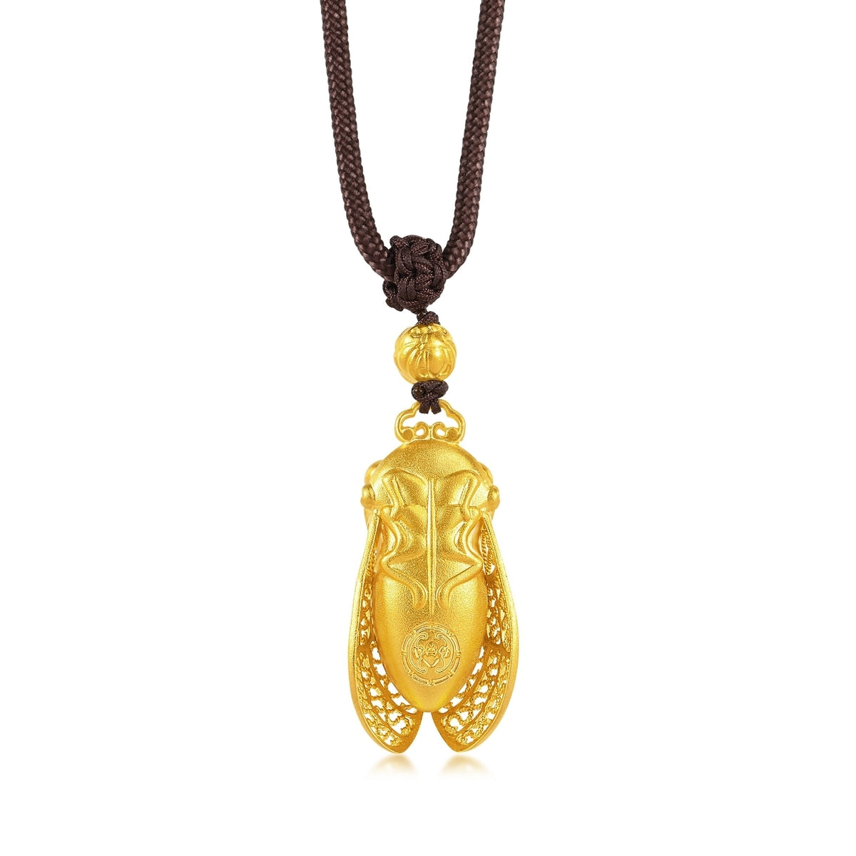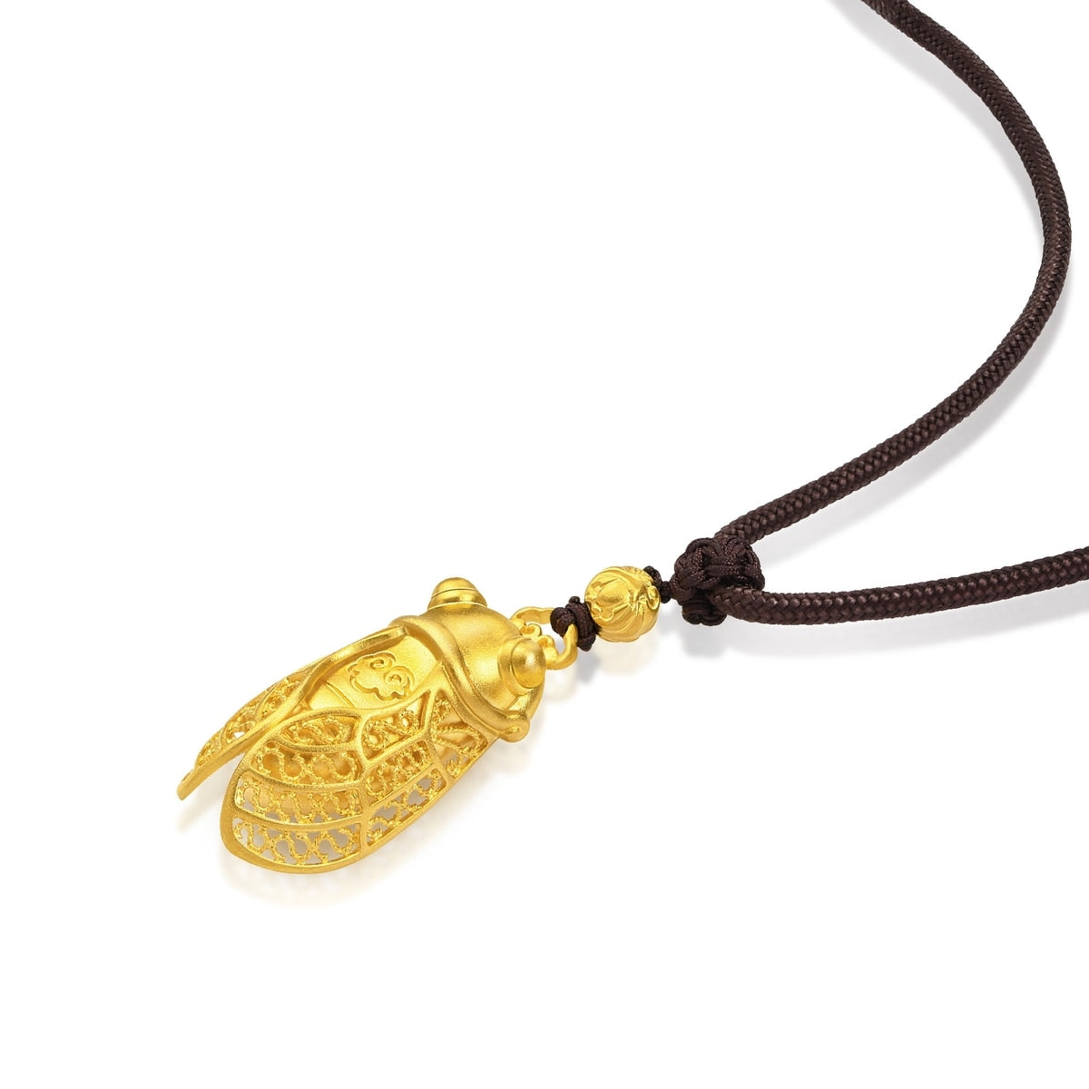 This Oriental 999.9 Gold Necklace by Chow Sang Sang showcases a beautifully forged cicada pendant in precious ancient gold. The cicada, with its intricate filigree wings, symbolizes wealth and prosperity, as the phonology of 'cicada' in Chinese signifies “money.” The thick cord features gold beads engraved with “bamboo” and “bat” motifs, representing abundant blessings.