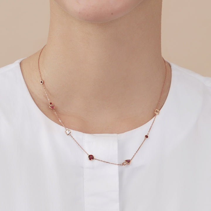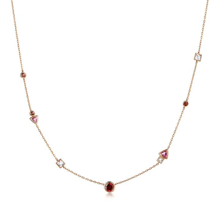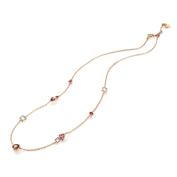 This Form 18K Rose Gold Garnet Necklace by Chow Sang Sang combines pink tourmaline, garnet, and rock crystal in playful geometric patterns, including triangular, circular, and square shapes. The semi-precious stones add vibrancy to this flexible and elegant necklace, making it a standout piece for any occasion.