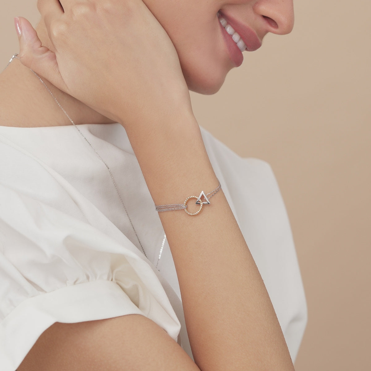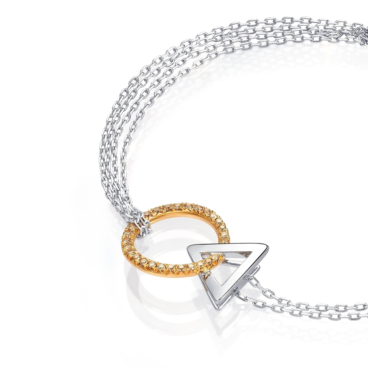 This Form 18K Yellow & White Gold Brown Diamond Bracelet by Chow Sang Sang combines two distinct colors of gold in a polished geometric design. The bracelet, adorned with brown diamonds, adds a sophisticated flair to any look, perfect for daily wear or special occasions.