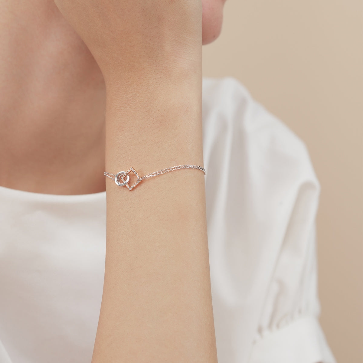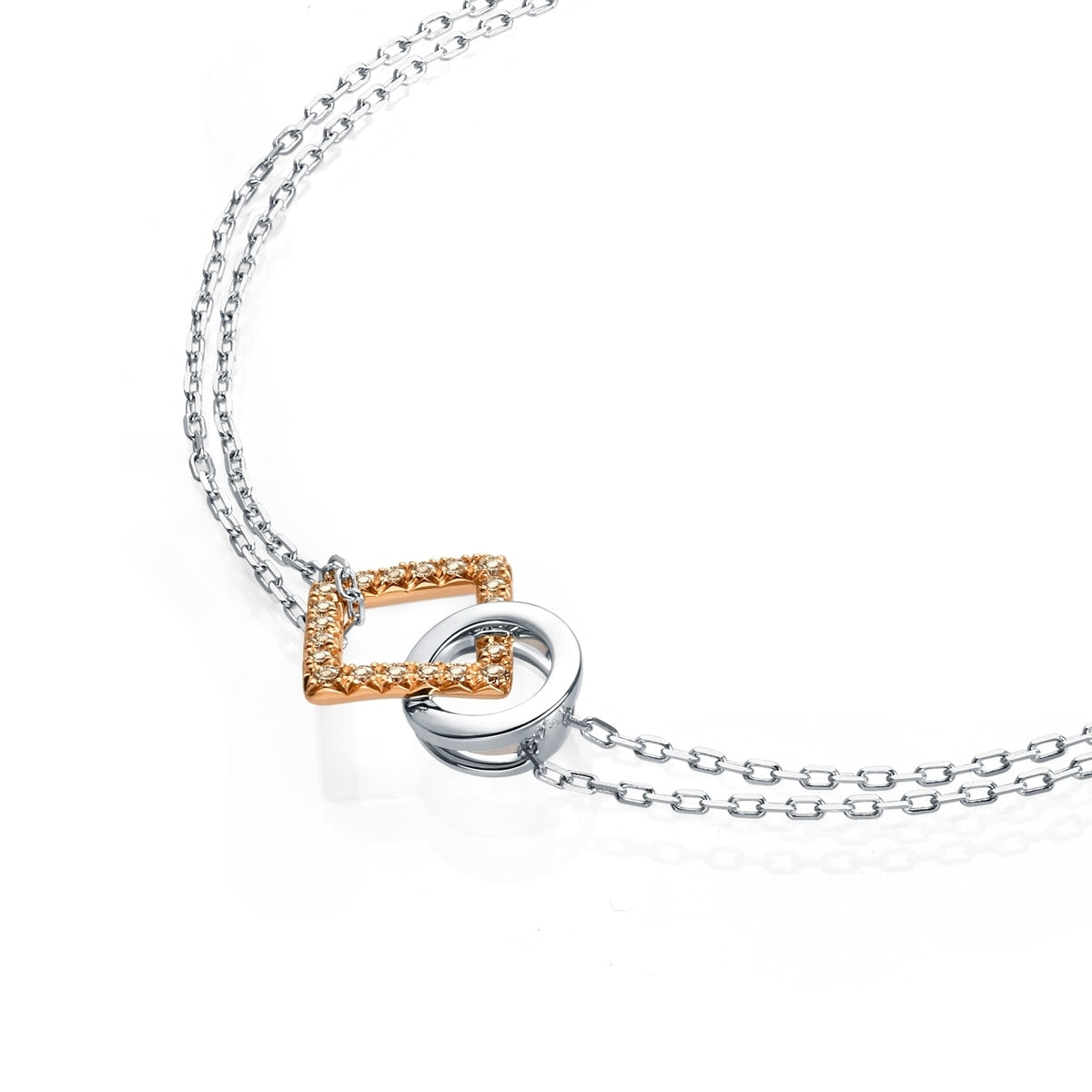 This Form 18K White & Red Gold Brown Diamond Bracelet by Chow Sang Sang combines two distinct colors of gold, featuring a polished geometric design. The mix of white and rose gold, paired with the warm tones of brown diamonds, creates a stylish and versatile bracelet, perfect for everyday wear or special occasions.