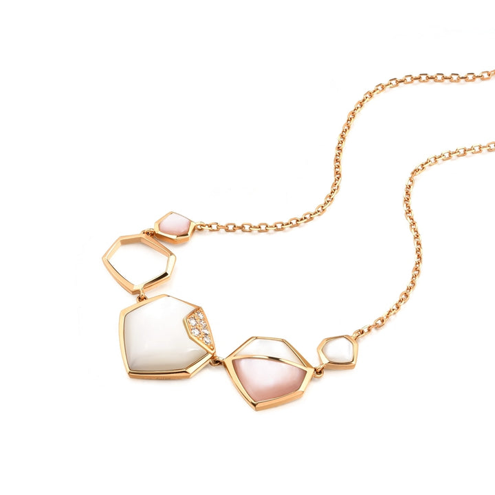 The 'Harmony 18K Rose Gold Mother of Pearl Necklace by Chow Sang Sang' features white and pink mother of pearls enhanced by brilliant diamonds. Its design embodies grace and amiable extravagance through geometric lines.