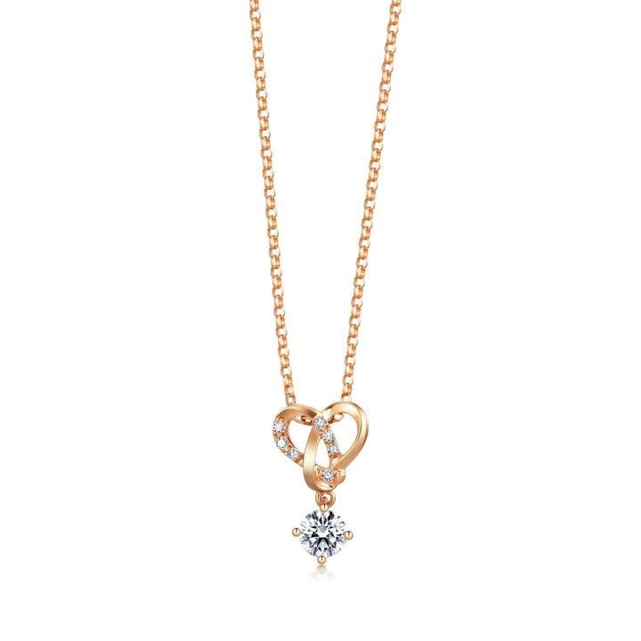 The 'Love Knot 18K Rose Gold Diamond Necklace by Chow Sang Sang' symbolizes eternal partnership and commitment. The love knot, set with dazzling diamonds, represents 'one life, one love' with an enthralling glow.