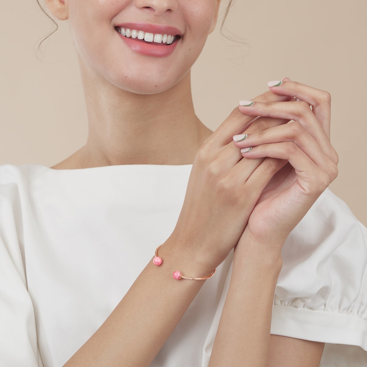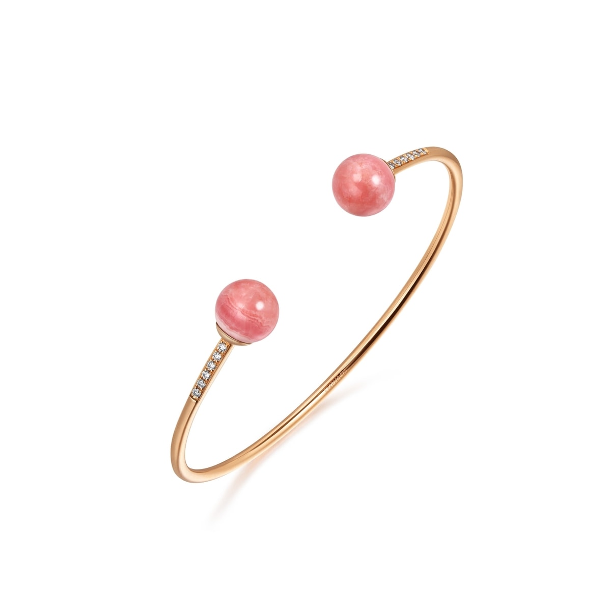 The 'Cosmos 18K Rose Gold Rhodochrosite Bangle by Chow Sang Sang' combines pink opal, symbolizing happiness and love, with diamonds in a wire bangle, offering versatility to mix and match with other jewelry.