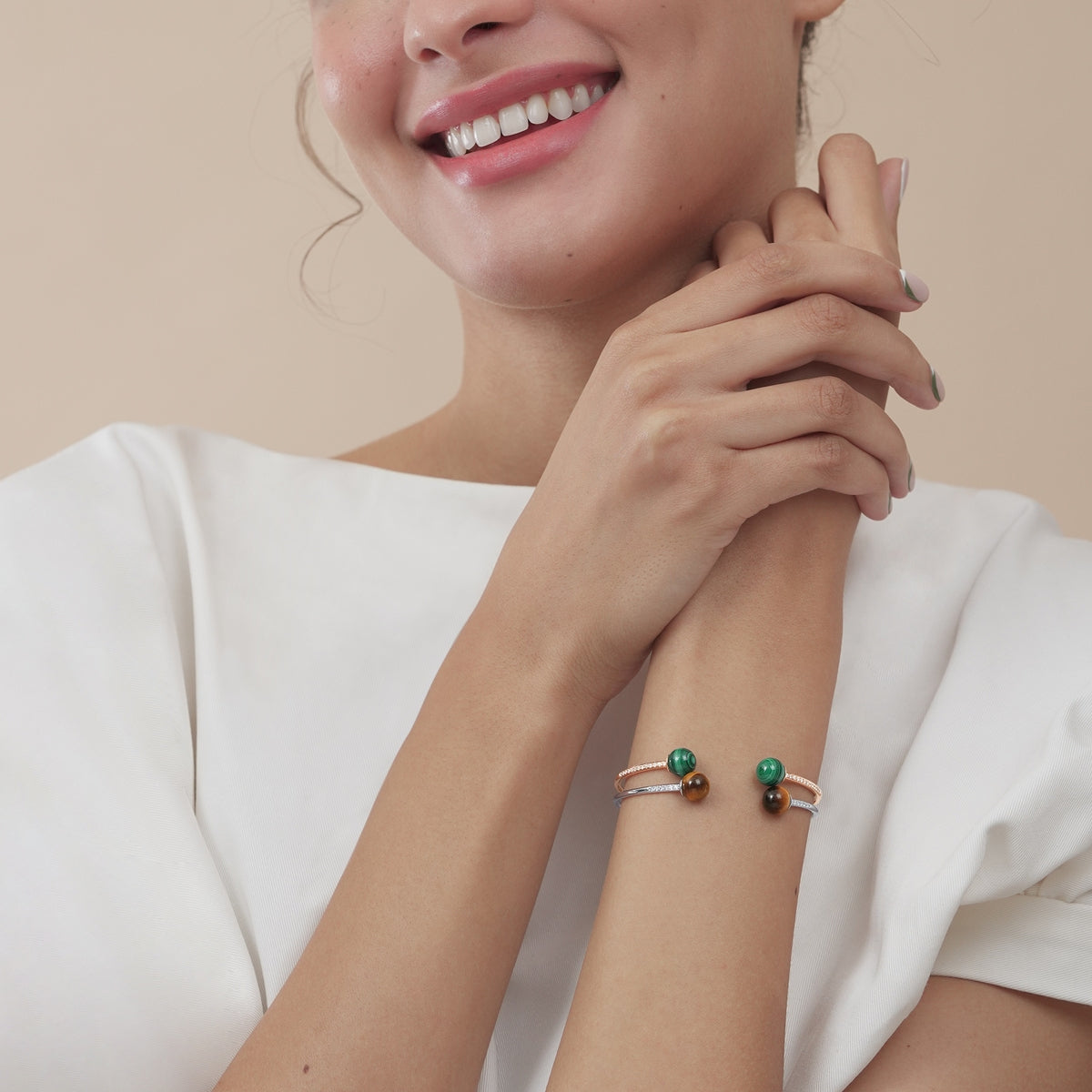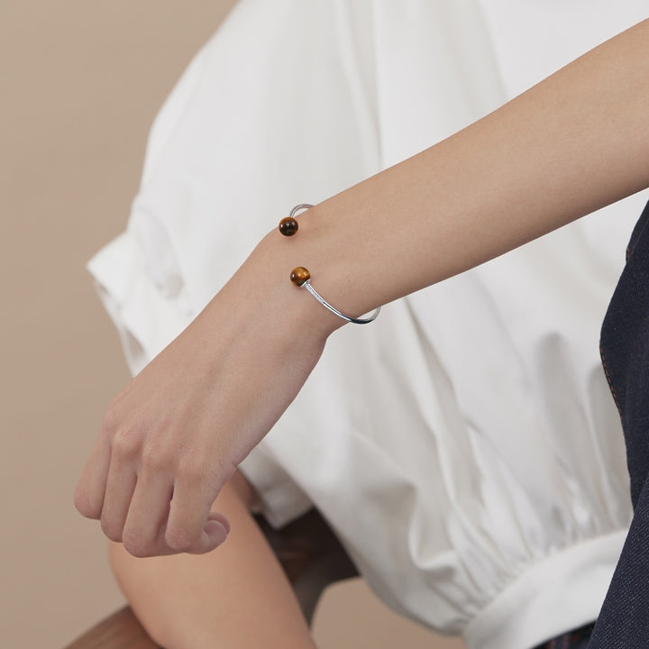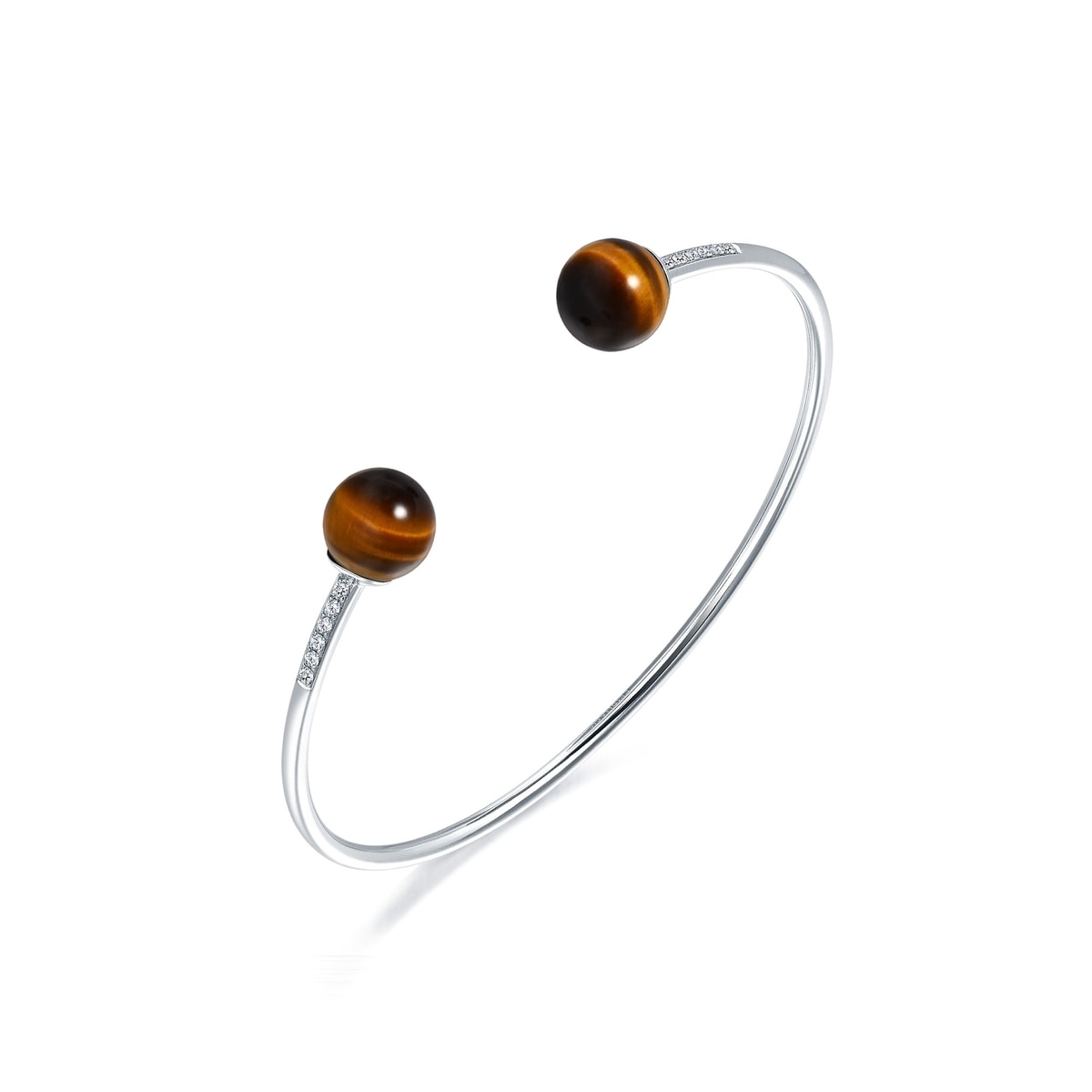 The 'Cosmos 18K White Gold Tiger’s Eye Bangle by Chow Sang Sang' symbolizes courage and self-confidence, featuring tiger’s eye with diamond accents in an elegant bangle design.