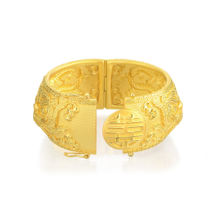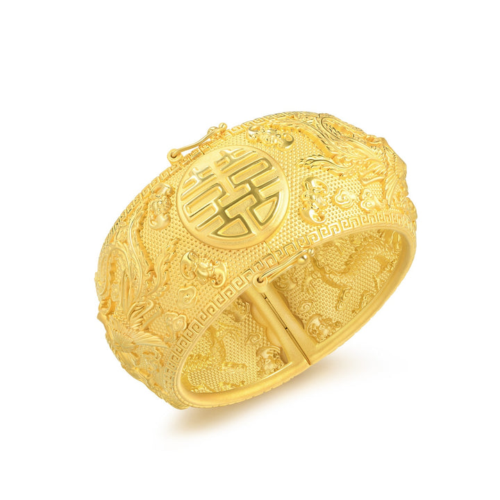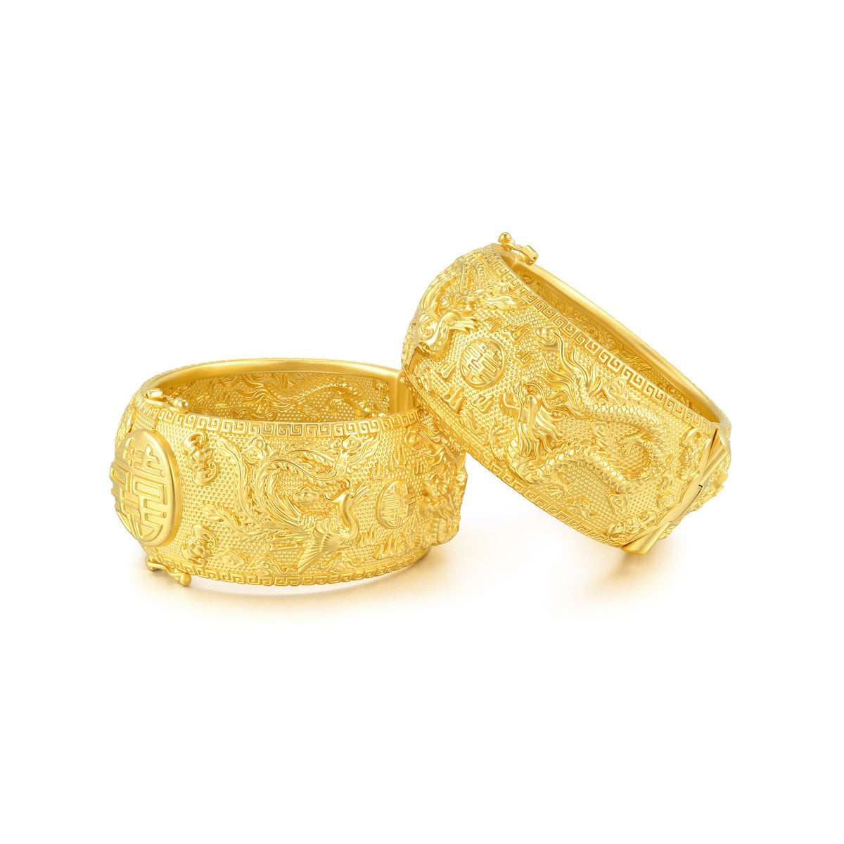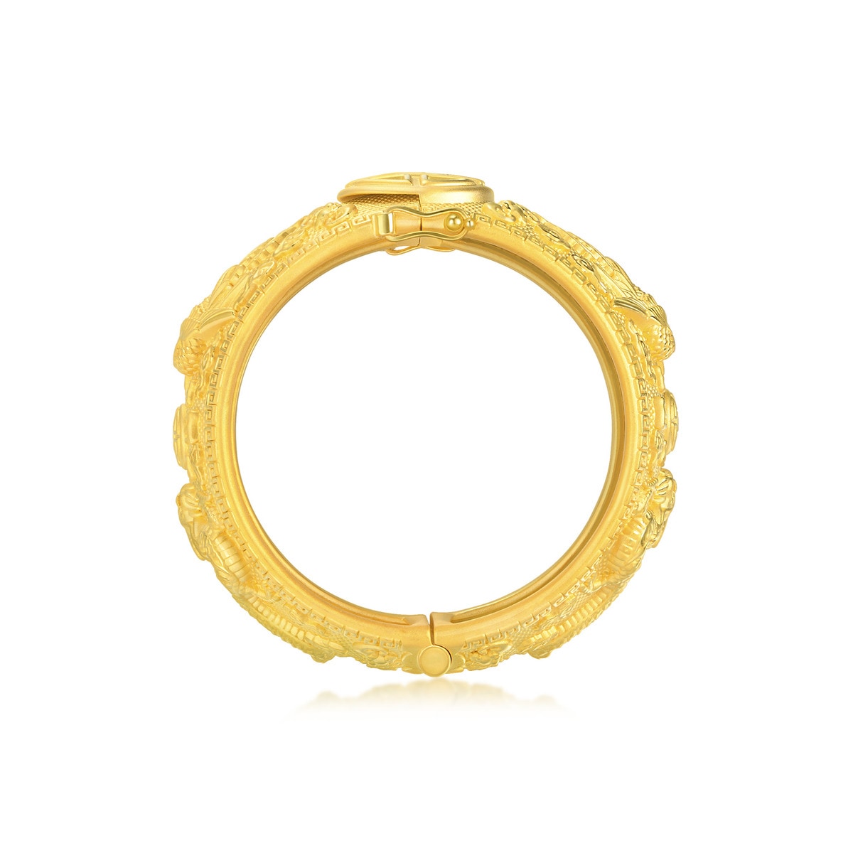 The Dragon & Phoenix 999.9 Gold Bangle by Chow Sang Sang symbolizes power, harmony, and balance. This luxurious bangle features intricate craftsmanship, making it a statement piece that reflects the strength of these mythical creatures.