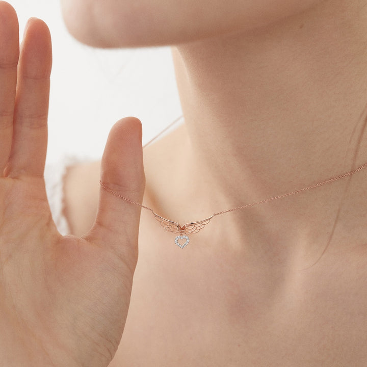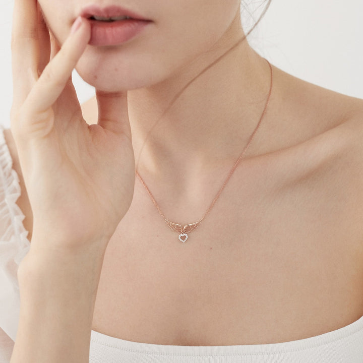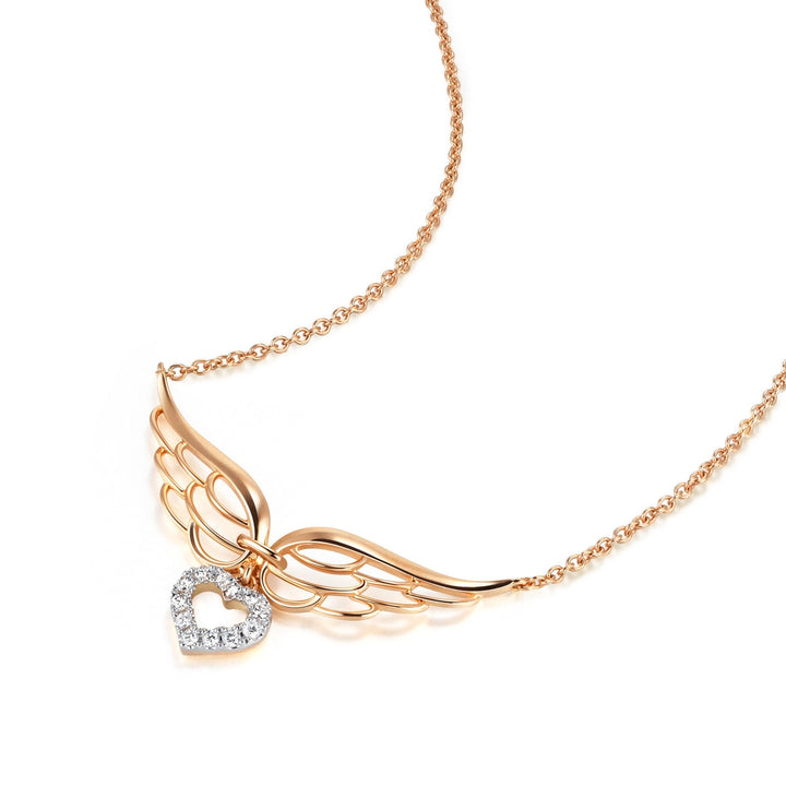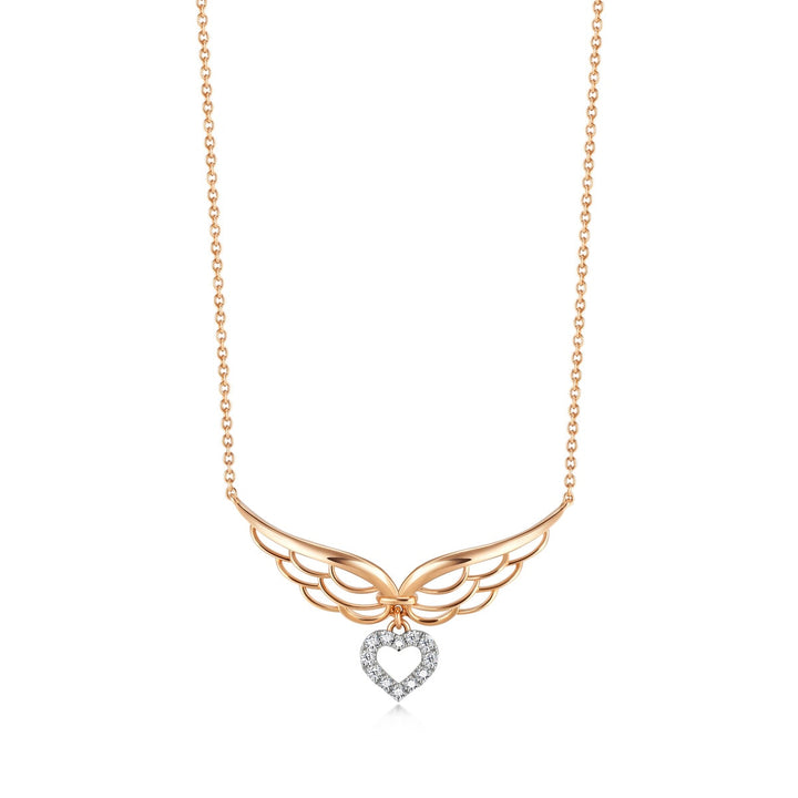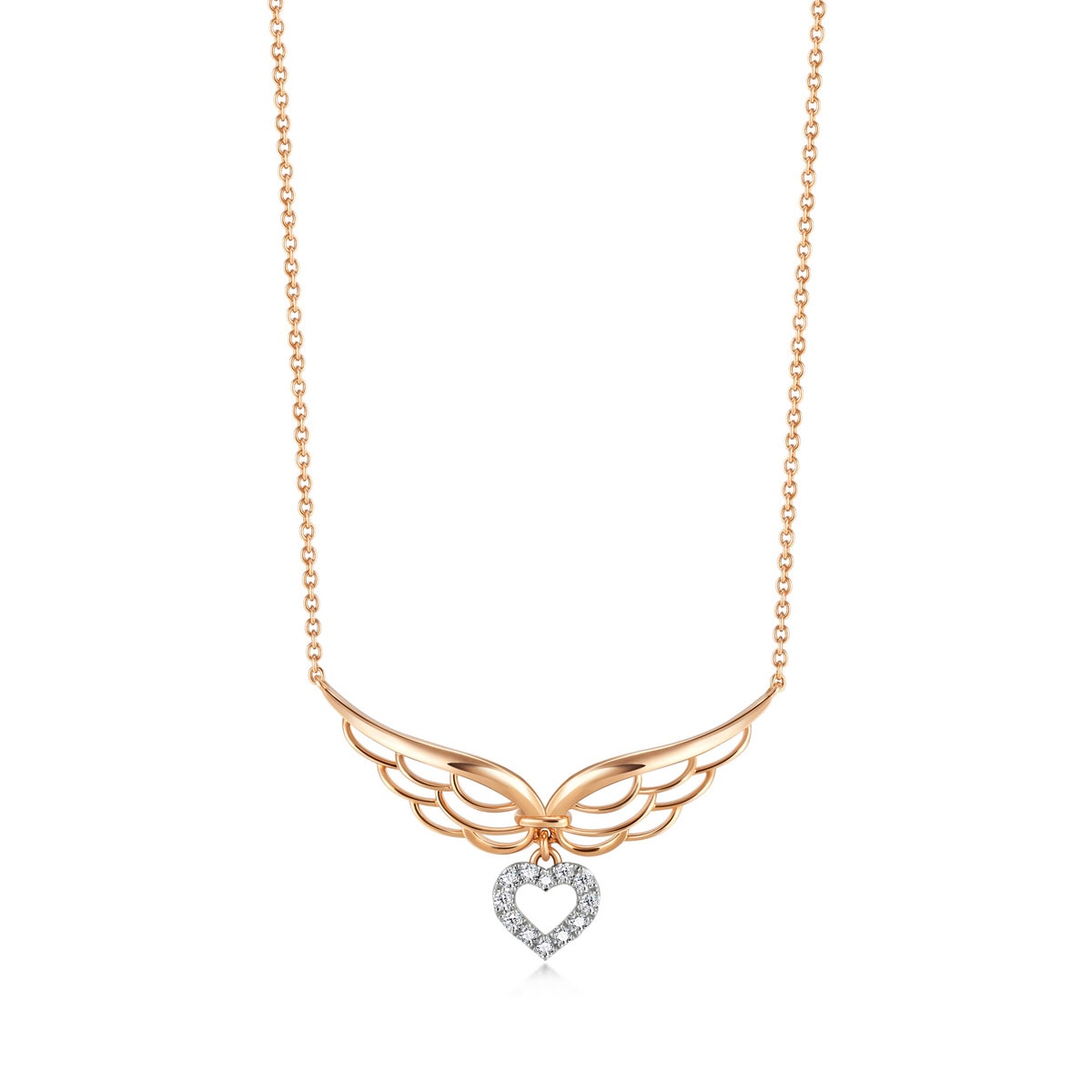 This 18K White & Red Gold Diamond Cupid Wings Necklace by Chow Sang Sang features hollow-carved wings with a heart-shaped pendant, symbolizing romantic commitment.