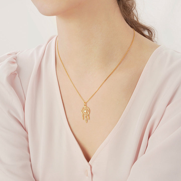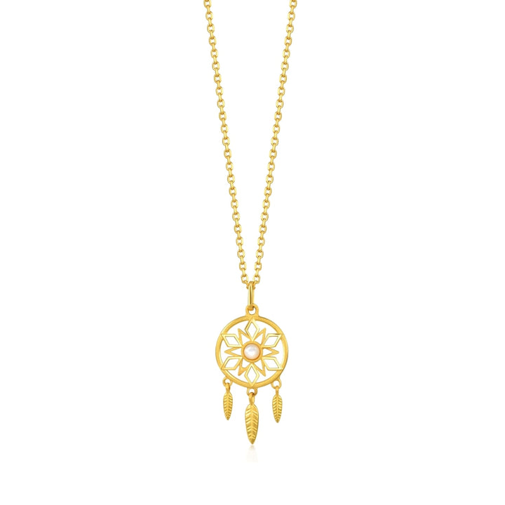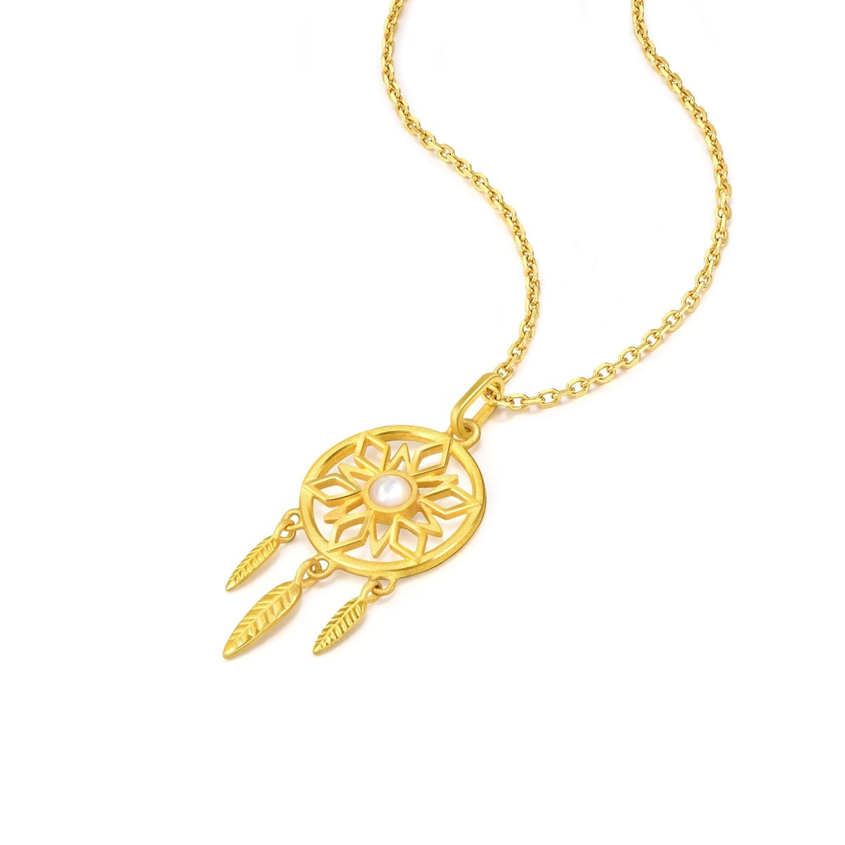 This 999.9 Gold Pendant by Chow Sang Sang is crafted in the shape of a dream catcher, symbolizing peace and luck, and adorned with a white mother of pearl at the center for added elegance.