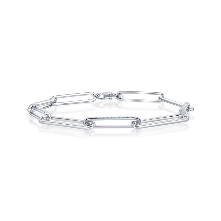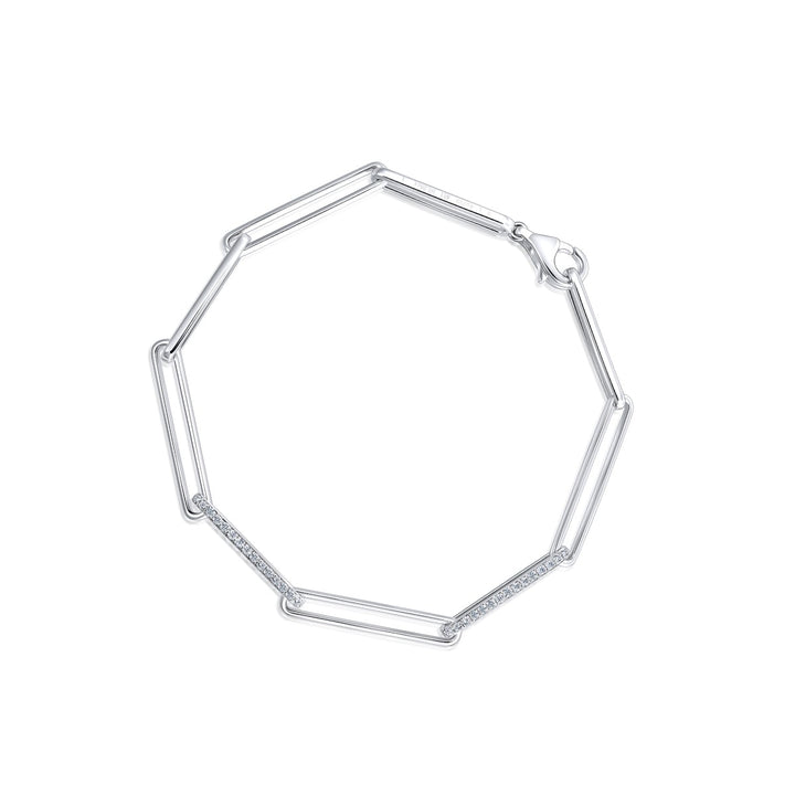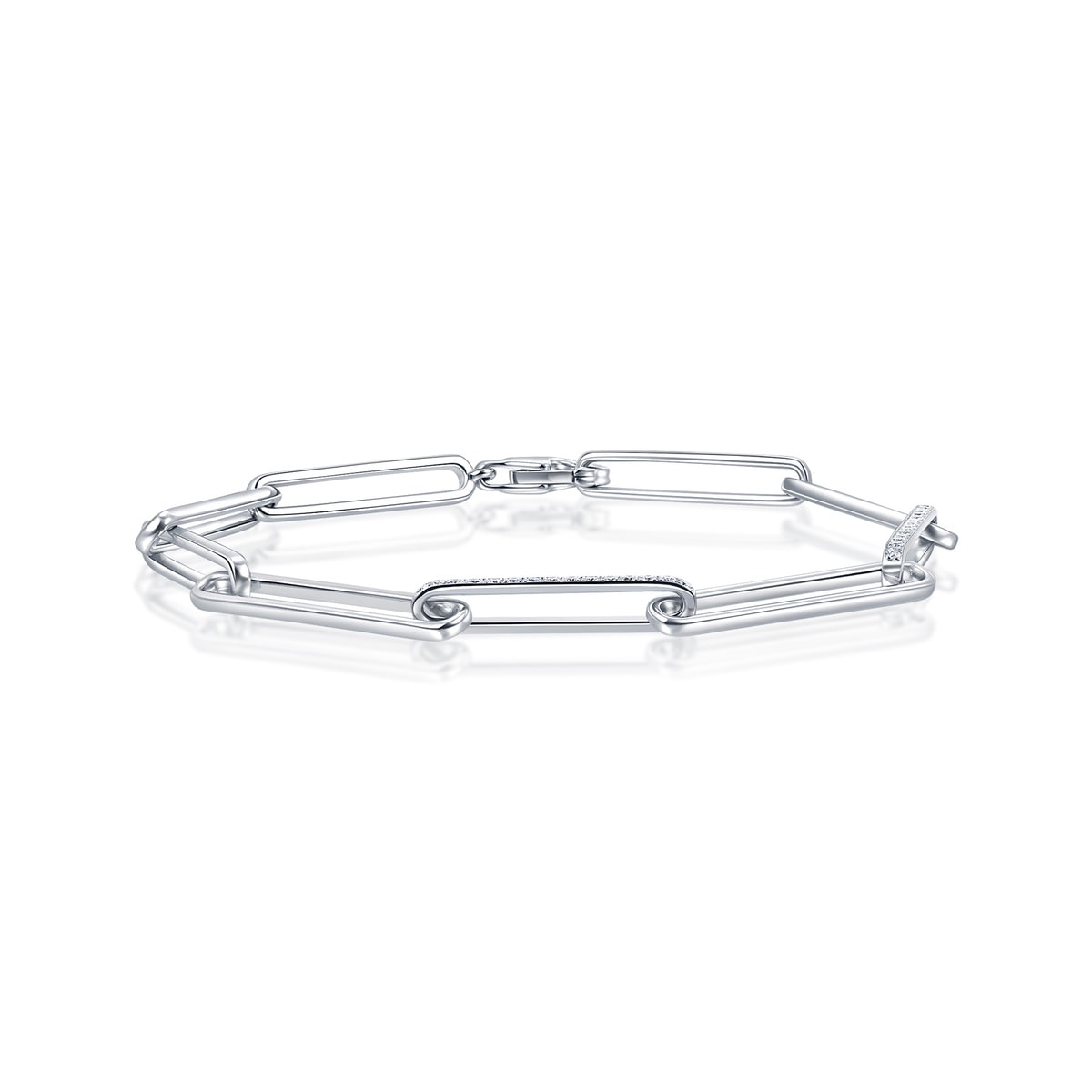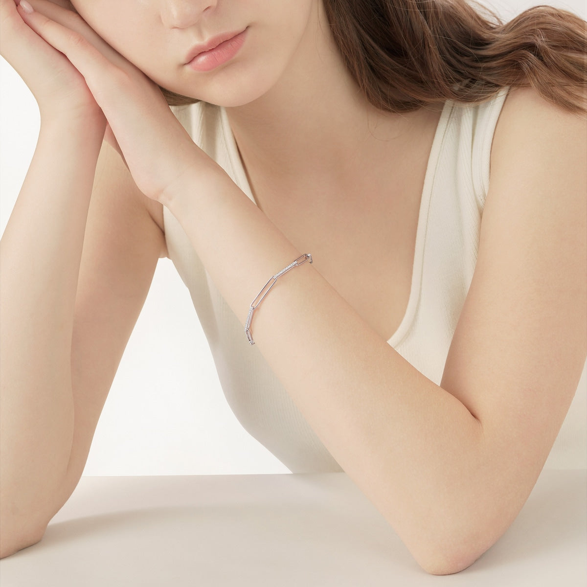 This 18K White Gold Diamond Bracelet by Chow Sang Sang features elegantly interlocking long chains, combining a polished surface with diamond settings for enhanced layering. Its refined design makes it a sophisticated accessory for both casual and formal occasions.