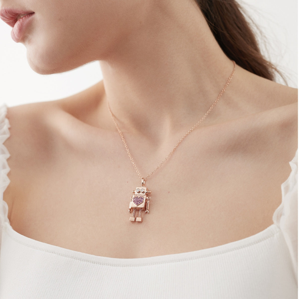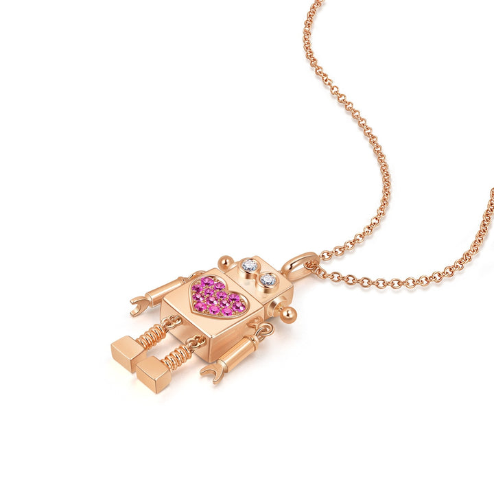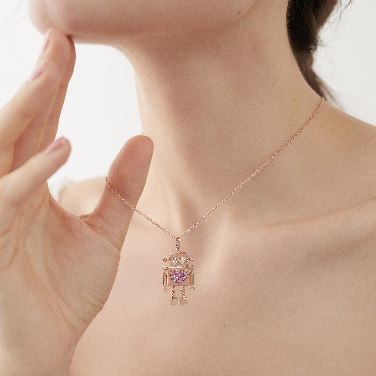 This 18K Rose Gold Pink Sapphire Necklace by Chow Sang Sang is inspired by the story of robots' immortal love. The largest pendant in this design series, it symbolizes unwavering love. The eyes and chest of the robot are set with diamonds and a pink sapphire, bringing a charming sweetness to the piece.