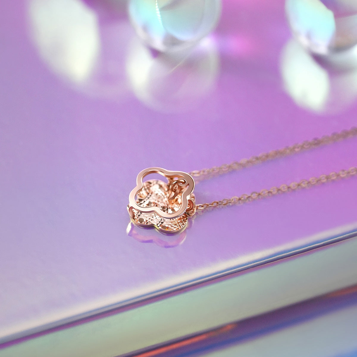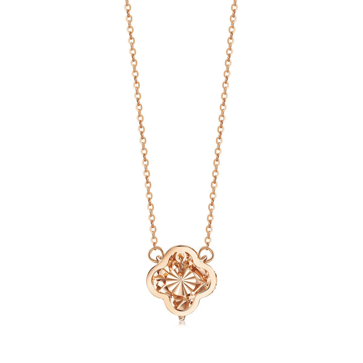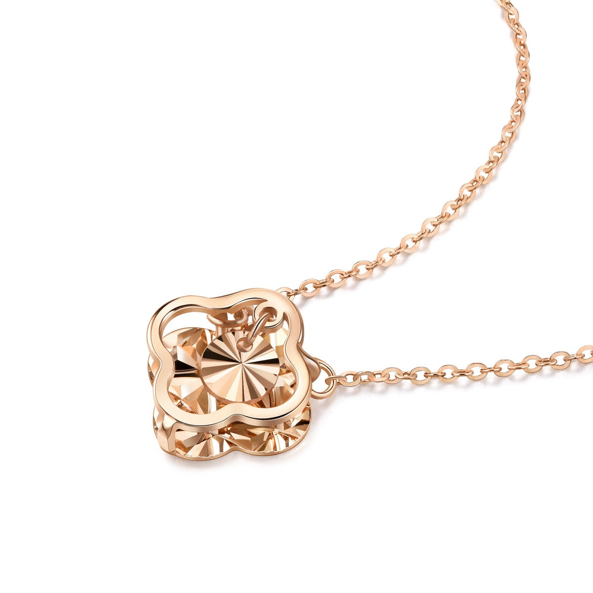 This 18K Rose Gold Necklace by Chow Sang Sang showcases a pleasing four-leaf clover design in a filigree frame. The center features a layered laser-engraved pattern, complemented by a delicately hanging mini circular plate, symbolizing luck and elegance.