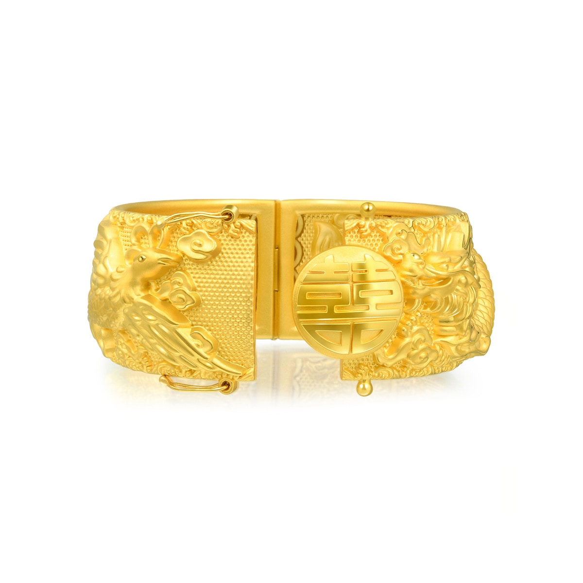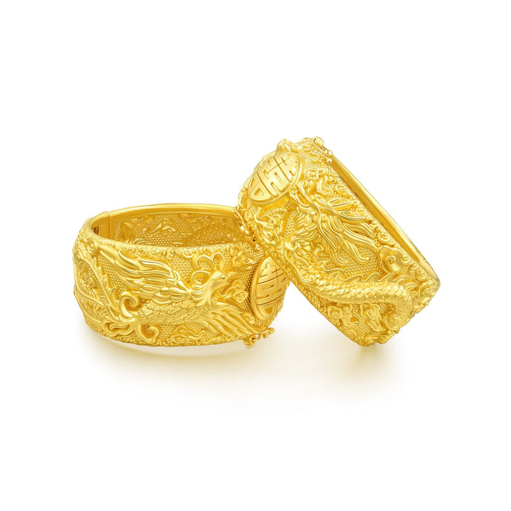 This 'Dragon & Phoenix' 999.9 Gold Bangle by Chow Sang Sang features a lively sculpted design of a dragon and phoenix, symbolizing auspiciousness and harmony. Crafted using the electroforming technique, this durable piece includes an iconic Double Happiness character engraved on the centered clasp, making it a meaningful choice for weddings or special occasions.