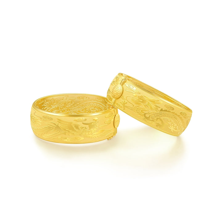 This 'Dragon & Phoenix' 999.9 Gold Bangle by Chow Sang Sang is accentuated by a sculpted dragon and phoenix, providing a unique reinterpretation of its auspicious appearance. The bangle features an iconic Double Happiness character engraved on both sides, symbolizing doubled joy and trendy elegance. Available in alternative thicknesses, this piece is perfect for weddings or celebrations.