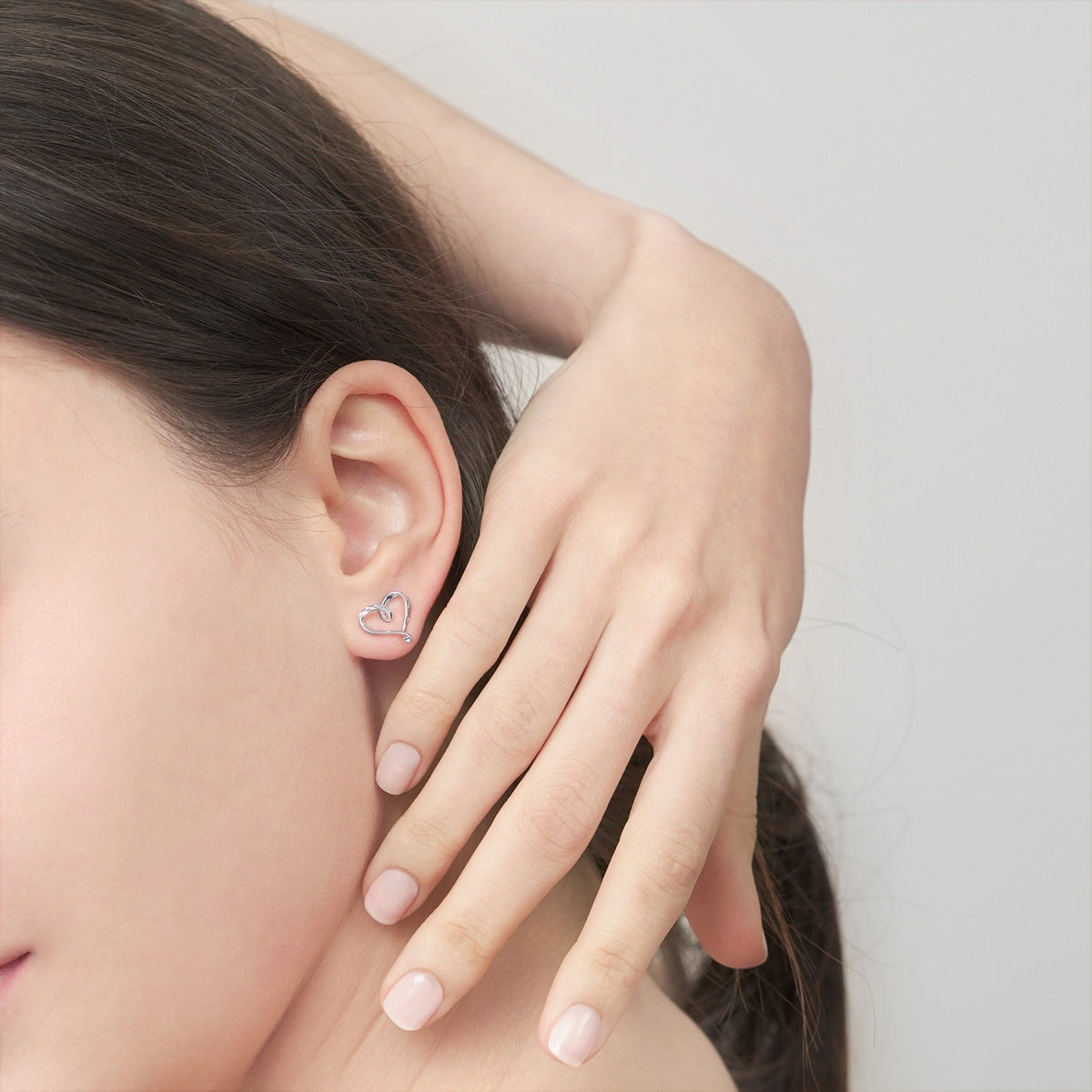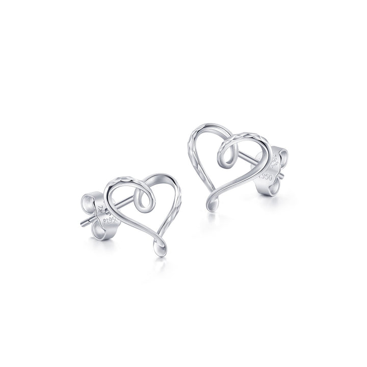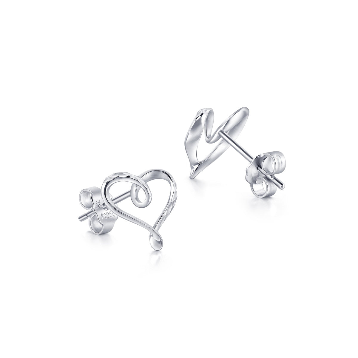 These 950 Platinum Heart Earrings by Chow Sang Sang feature a smooth, linear design with heart shapes, elegantly engraved with refined curves. The hammered pattern adds layers of texture, enhancing their versatility for both casual and formal styling.