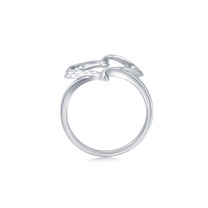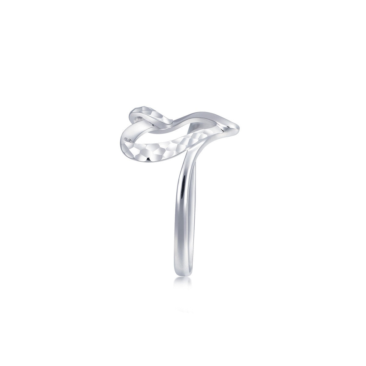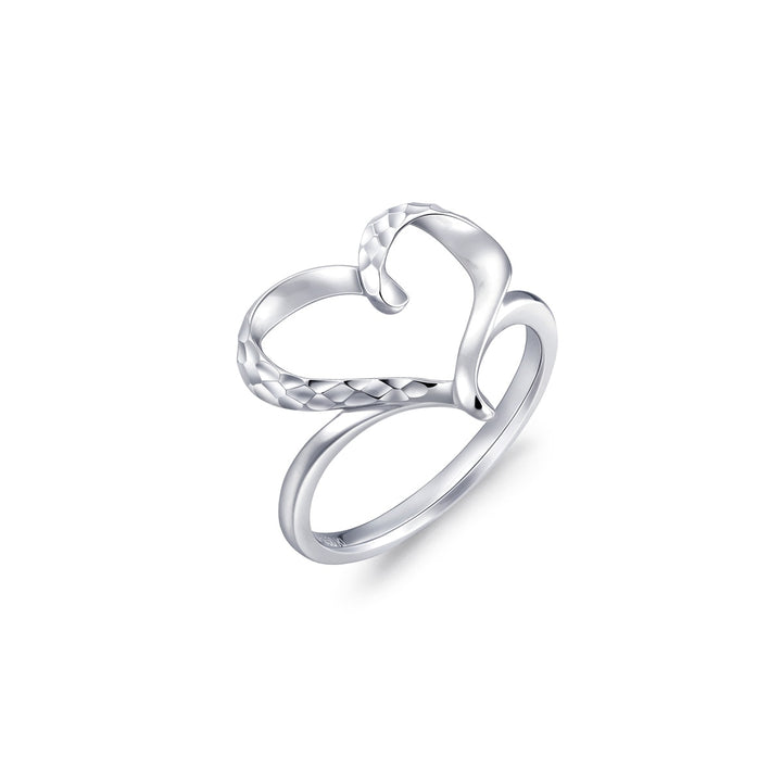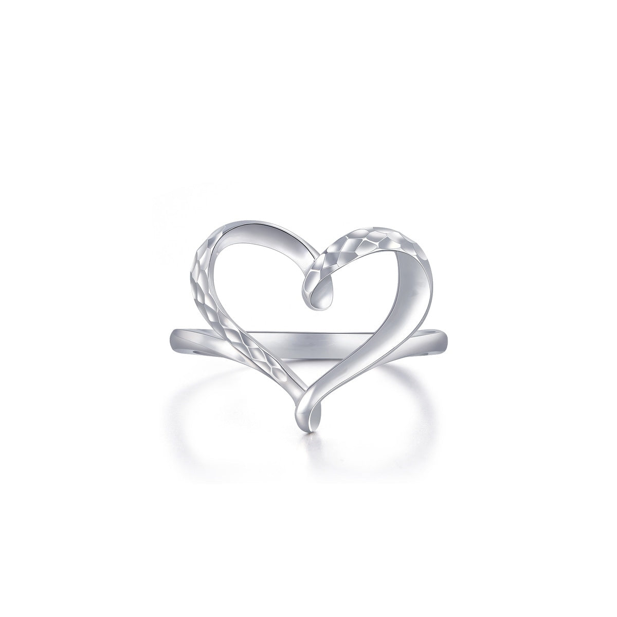 This 950 Platinum Ring by Chow Sang Sang features a smooth, linear heart shape, elegantly engraved with refined curves. The hammered pattern enhances its beauty, making it a versatile piece that can be worn alone or stacked with other rings.