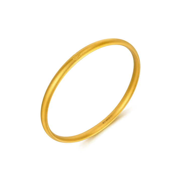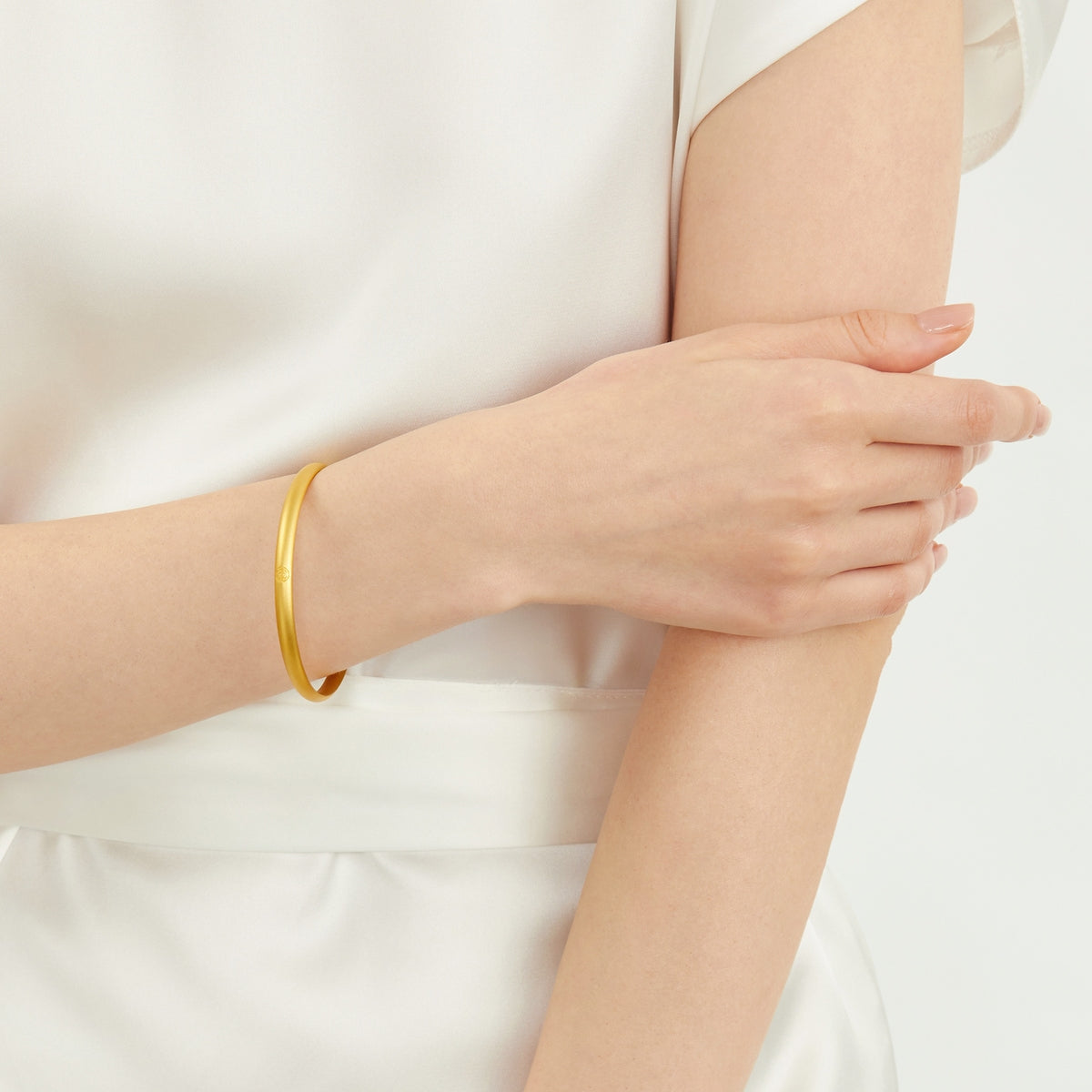 This 'The Oriental' 999.9 Gold Bangle by Chow Sang Sang is forged in precious ancient gold, offering a flat, solid design that magnifies its power and elegance. Slightly larger than standard size, the bangle features a brushed texture for a delicate matte surface. The exclusive “bamboo” and “bat” engravings symbolize auspicious wishes for abundant blessings.