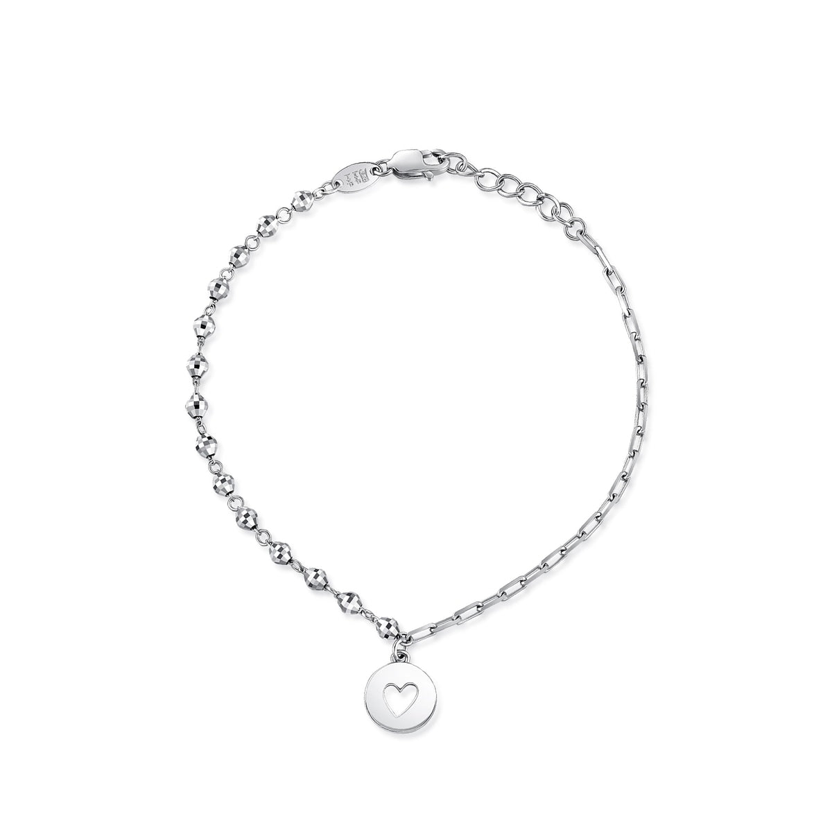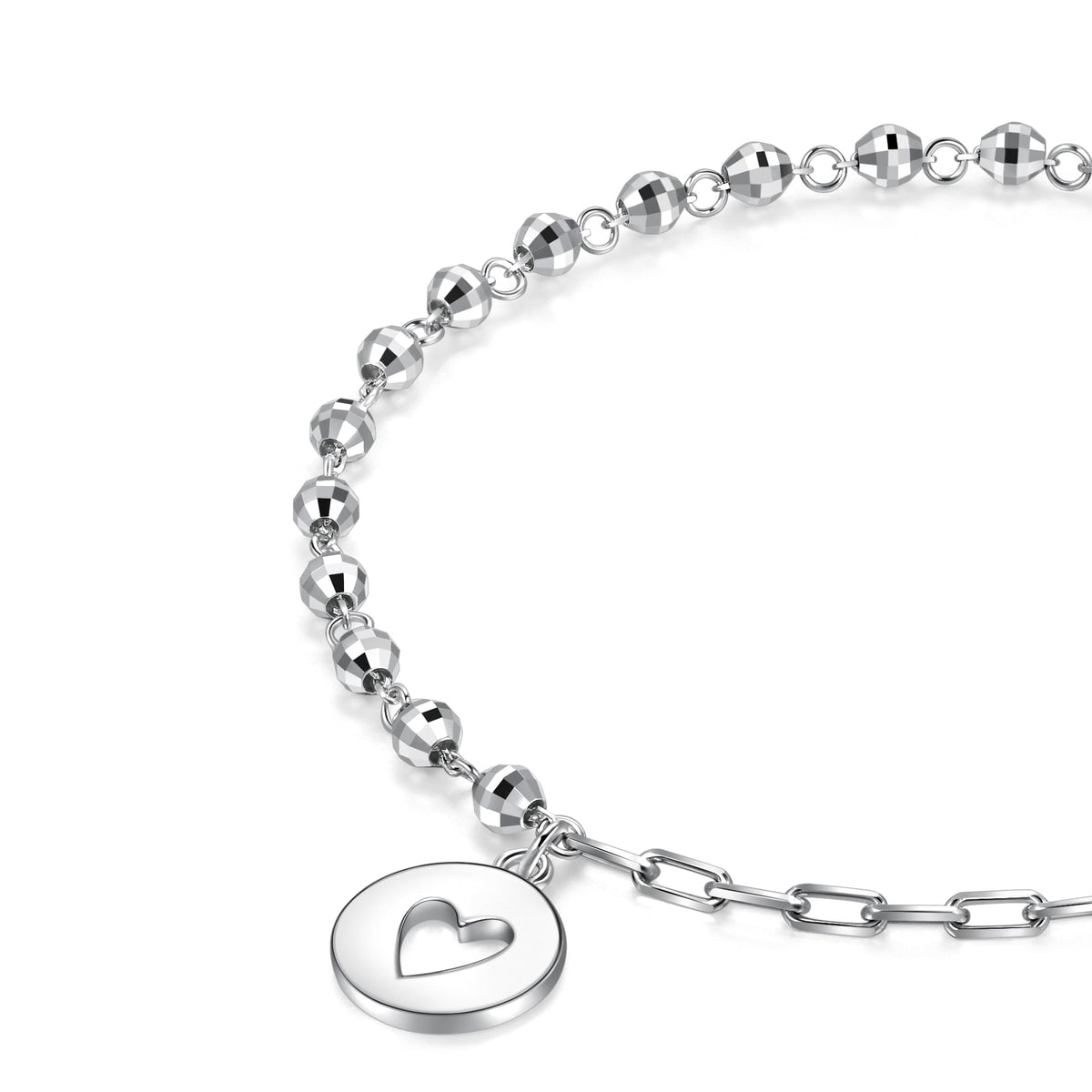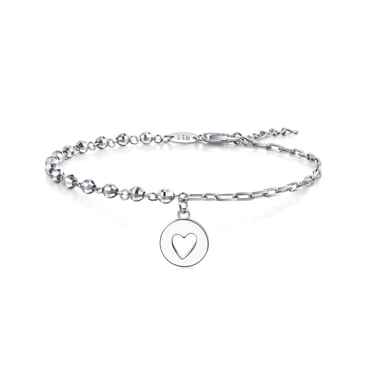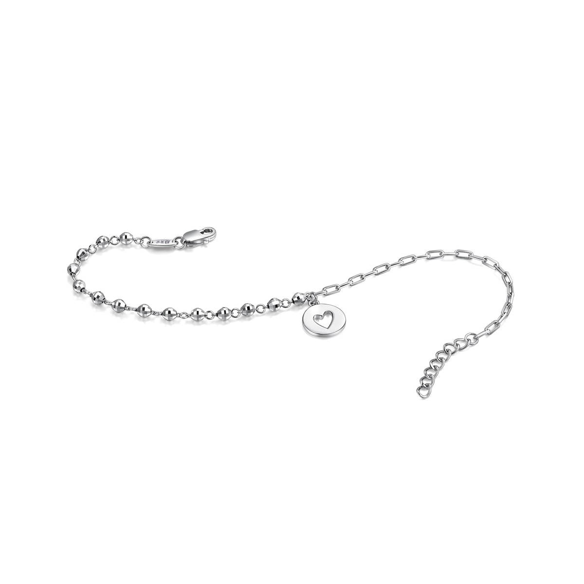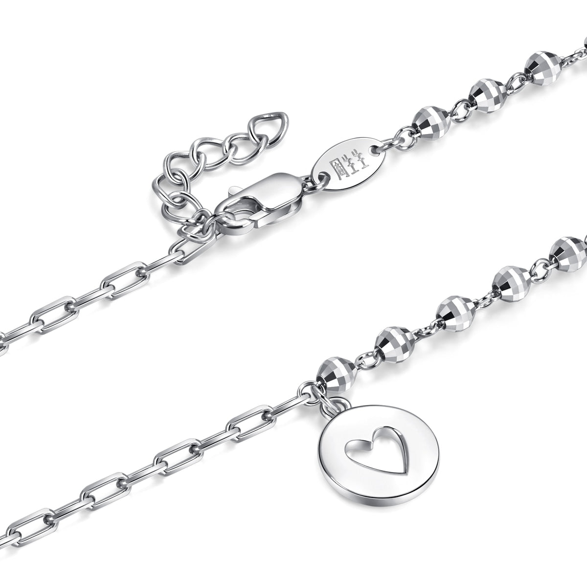 This 950 Platinum Bracelet by Chow Sang Sang combines long cable chains with ball chains, adorned with a hollow-carved heart on a round embellishment. It transforms a subtly cute style with its sparkling design, adding a playful touch to any outfit.