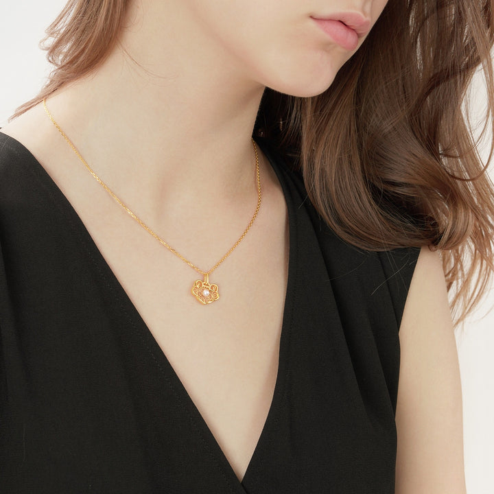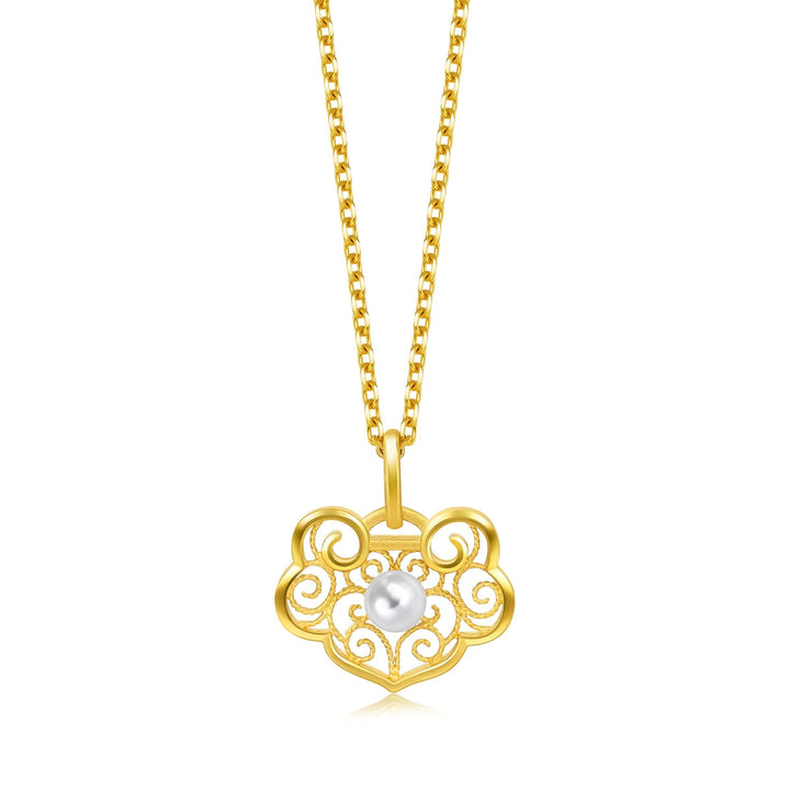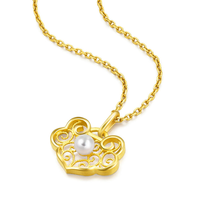 This 999.9 Gold Pendant by Chow Sang Sang takes inspiration from the hollow carving techniques of Orissa, India. It features an elegant Chinese Ruyi lock design with a lace-like pattern and a centered pearl, symbolizing ample blessings.