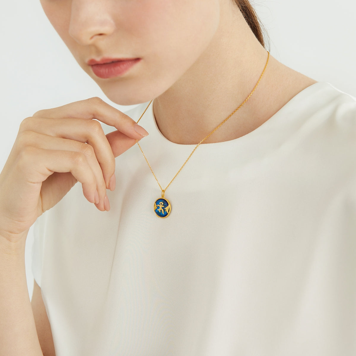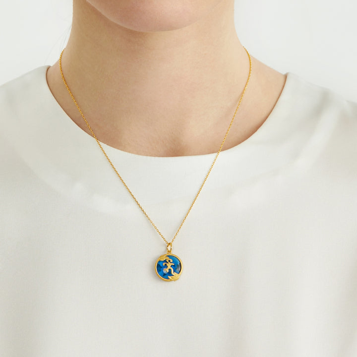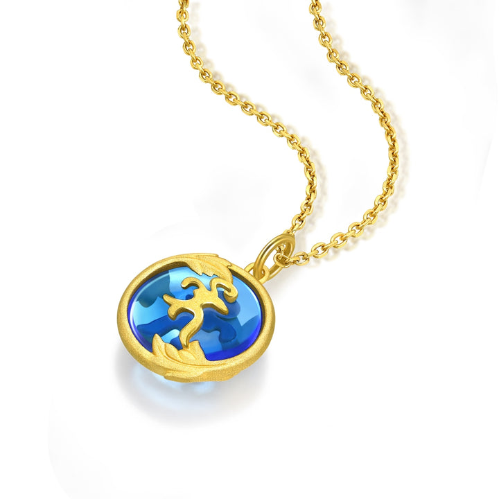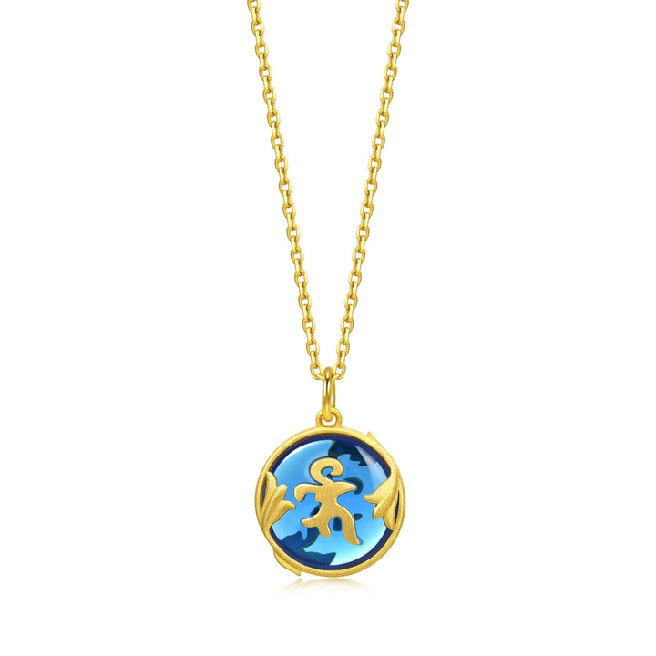 This 'Fate with Buddha' 999.9 Gold Pendant by Chow Sang Sang features the Sanskrit “Medicine Buddha Sutra” embedded in a glass of signature blue. The gold frame, decorated with myrobalans, blesses the wearer with good health and peace.
