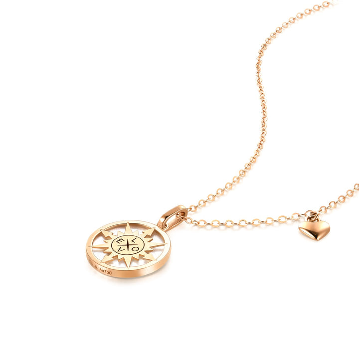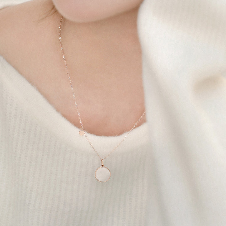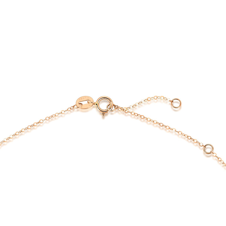 Crafted in 18K Rose Gold with a base of white mother of pearl, weighing approximately 0.047 tael (~1.759g). The necklace measures 47cm in length.