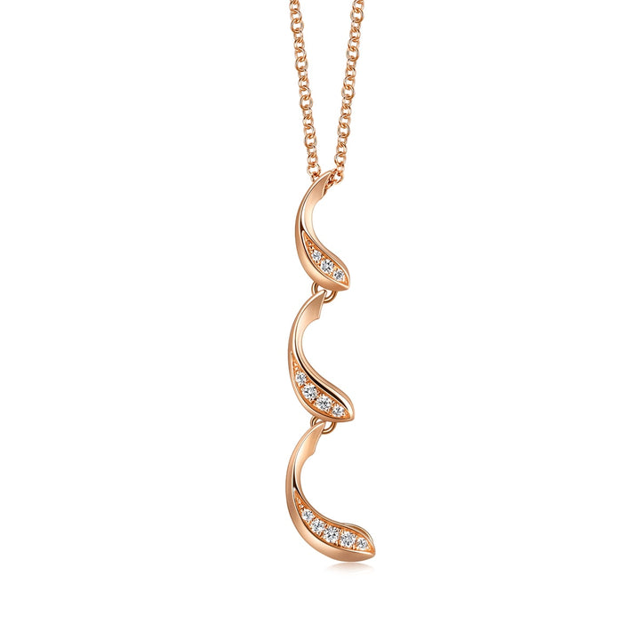 This 18K Rose Gold Diamond Necklace by Chow Sang Sang is a versatile and elegant piece. The bendable design features three wave shapes set with fine diamonds, allowing it to be styled in various ways. When stretched, it forms a long wave, and when closed, it becomes a complete circle.