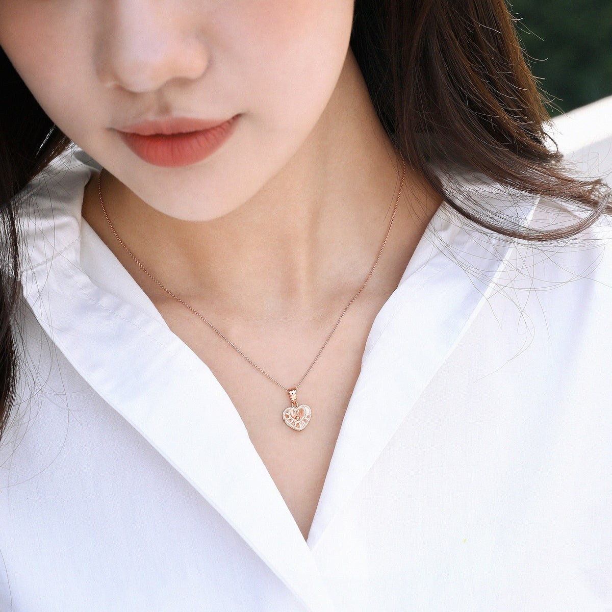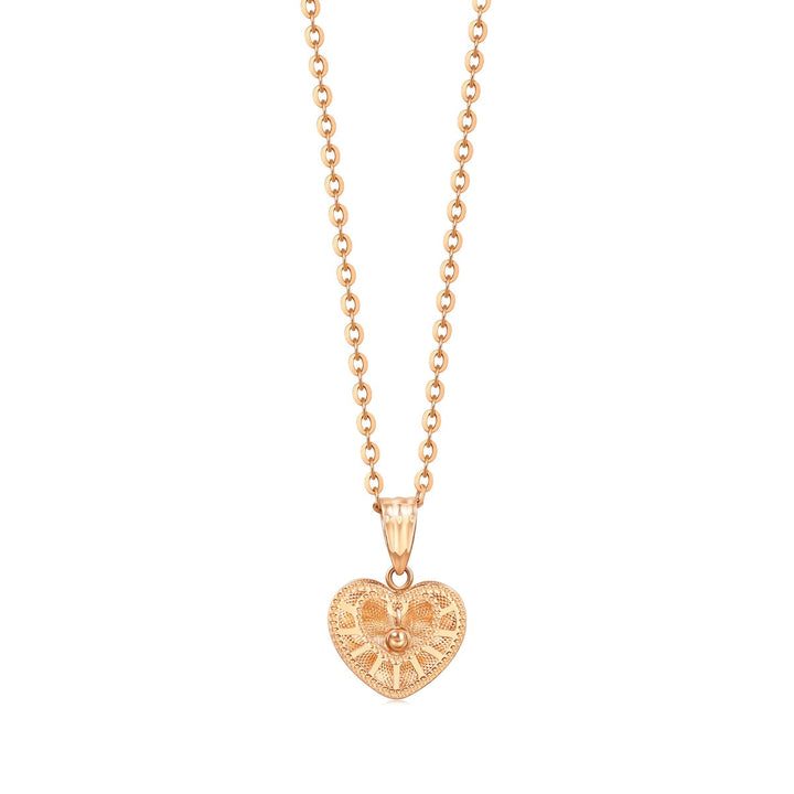 This 18K Rose Gold Pendant by Chow Sang Sang features a heart-shaped design with a hollow-carved center, decorated with engraved patterns. The double rows of engraved beads outline the heart, while a dangling bead swings with the wearer's movement, adding a cute sparkle to any look.