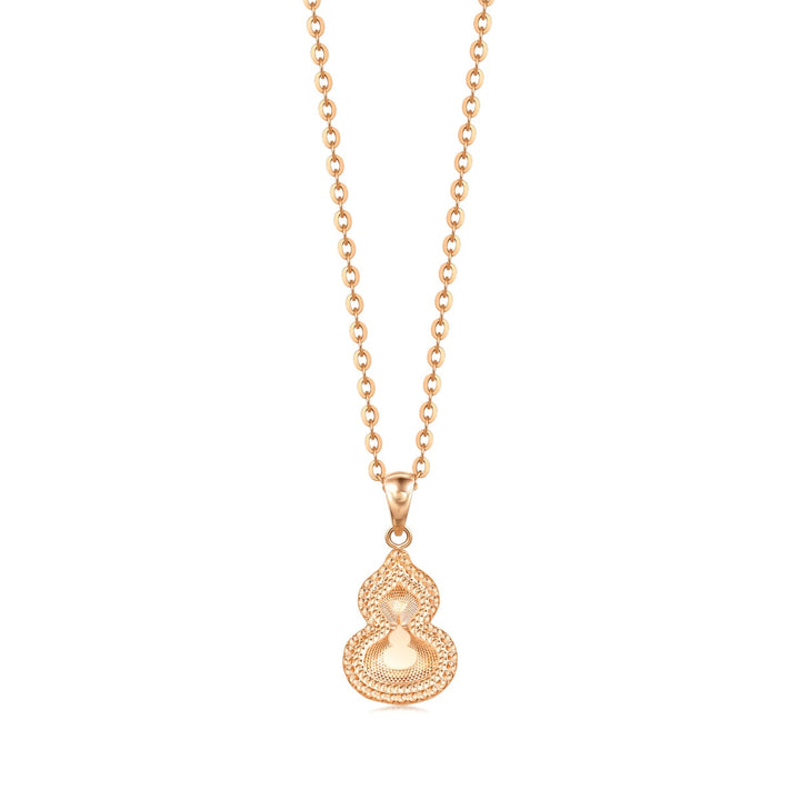 This 18K Rose Gold Gourd Pendant by Chow Sang Sang is a symbol of prosperity and good fortune. The gourd design is highlighted by multiple layers of engraved beads in various sizes, creating a sophisticated layered look.