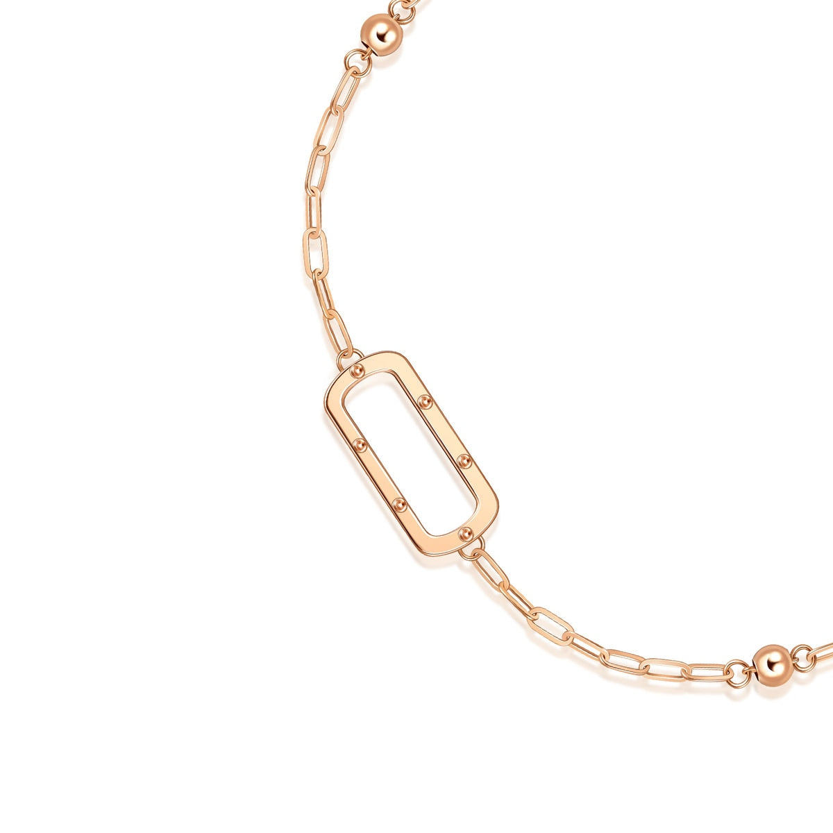This 18K Rose Gold Bracelet by Chow Sang Sang features a long oval-shaped design, embedded with engraved beads and tiny balls for a graceful and stylish look. Perfect for adding elegance to any occasion.