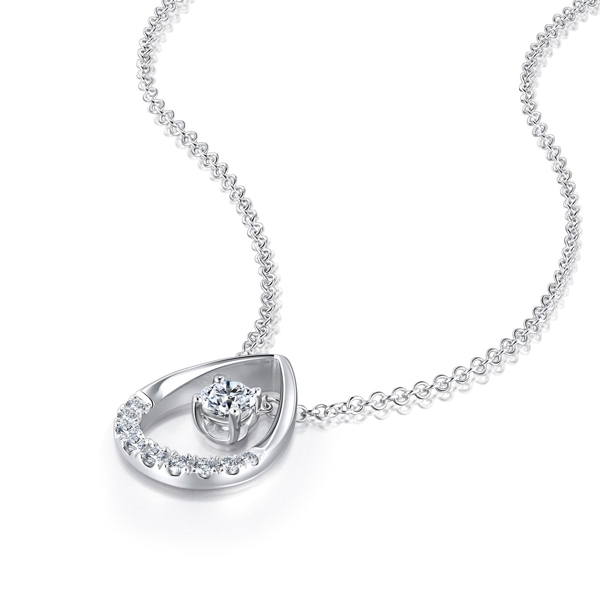 This 18K White Gold Diamond Necklace by Chow Sang Sang features a central diamond surrounded by a waterdrop-shaped frame, with encircling diamonds adorning the bottom half. Minimal and fashionable, this piece is perfect for adding subtle elegance to any daily look.