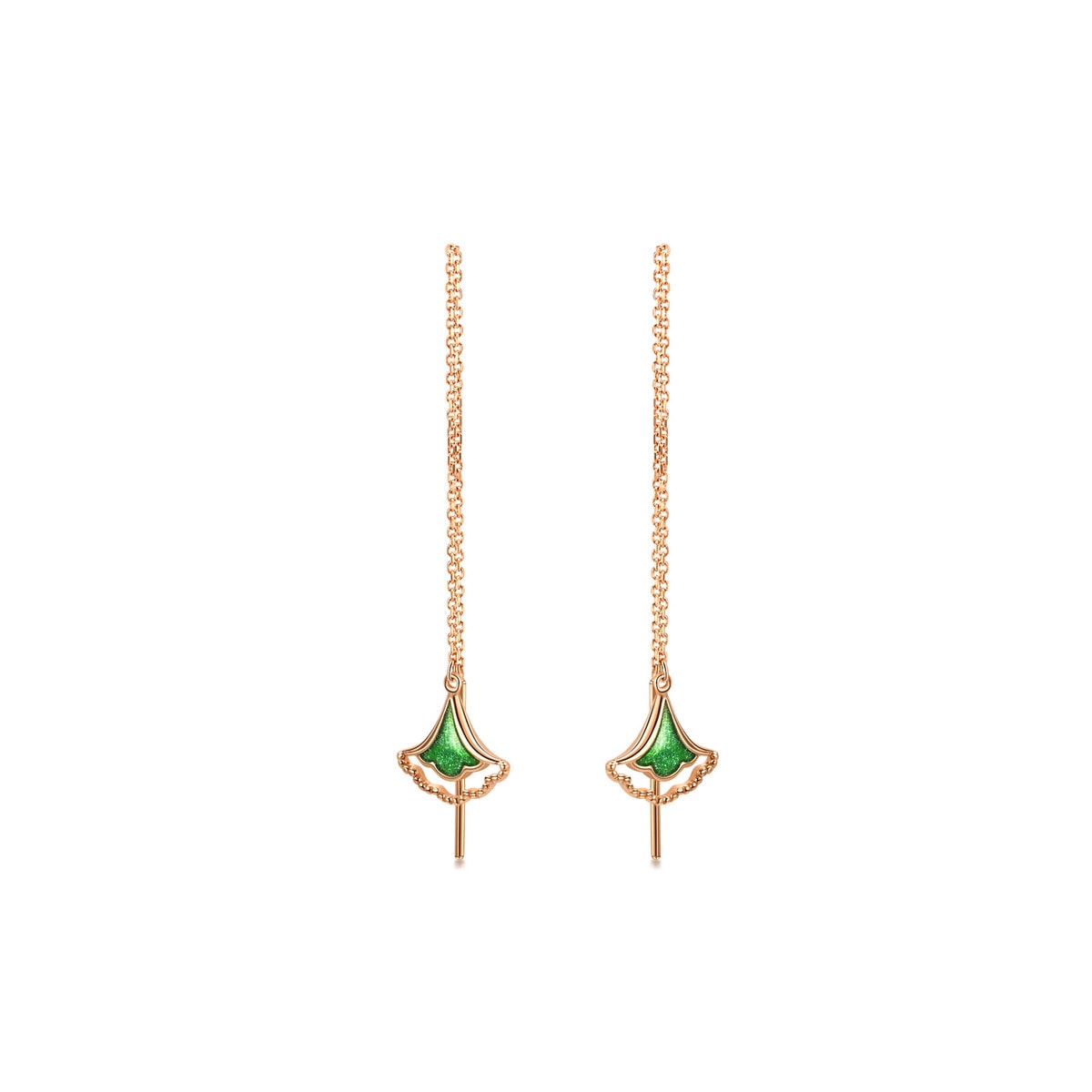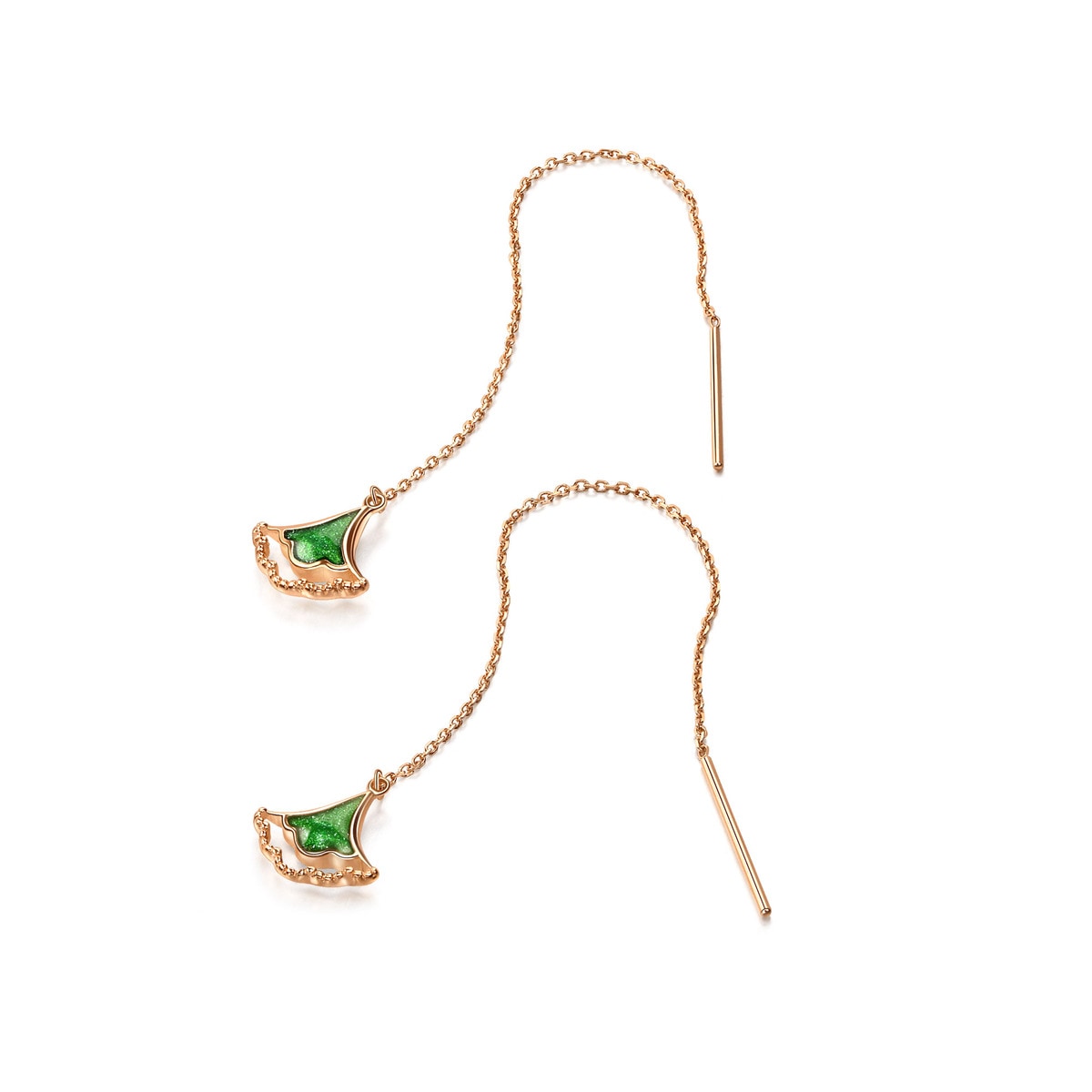 These 18K Rose Gold Earrings by Chow Sang Sang embody the symbolism of forever love and sweet romance with a graphical representation of the gingko leaf. One earring is framed with a delicate line of tiny beads, while both feature green enamel detailing and hollow-carved red gold frames for added elegance.