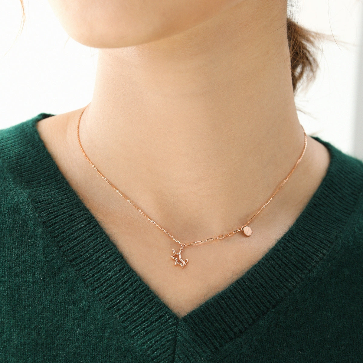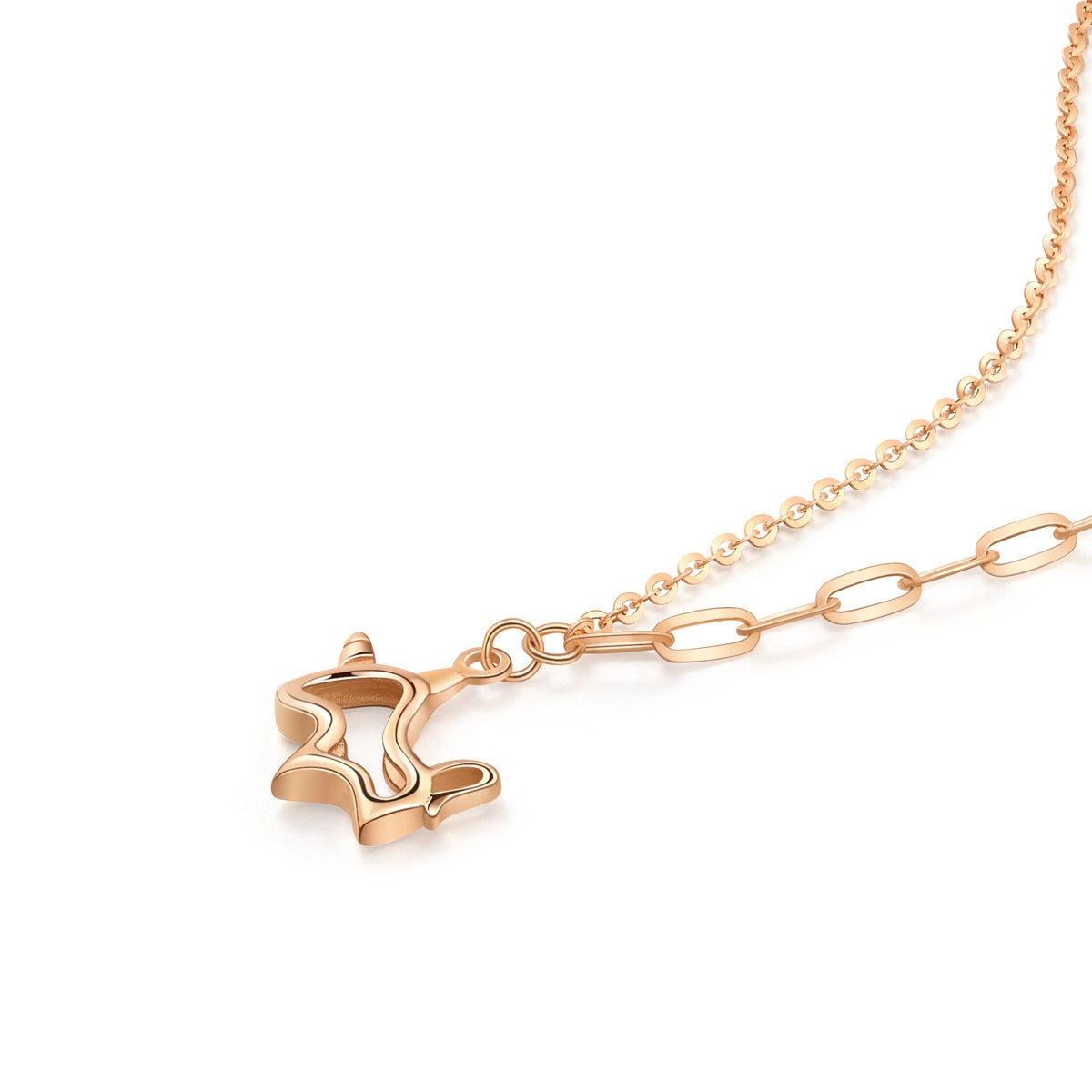 This 18K Rose Gold Necklace by Chow Sang Sang embodies sweet and youthful exuberance, with a unicorn contour outlined in a linear design. The centered cable chain features a dangling round embellishment engraved with the word 'LOVE,' adding a touch of sentiment to the playful design.