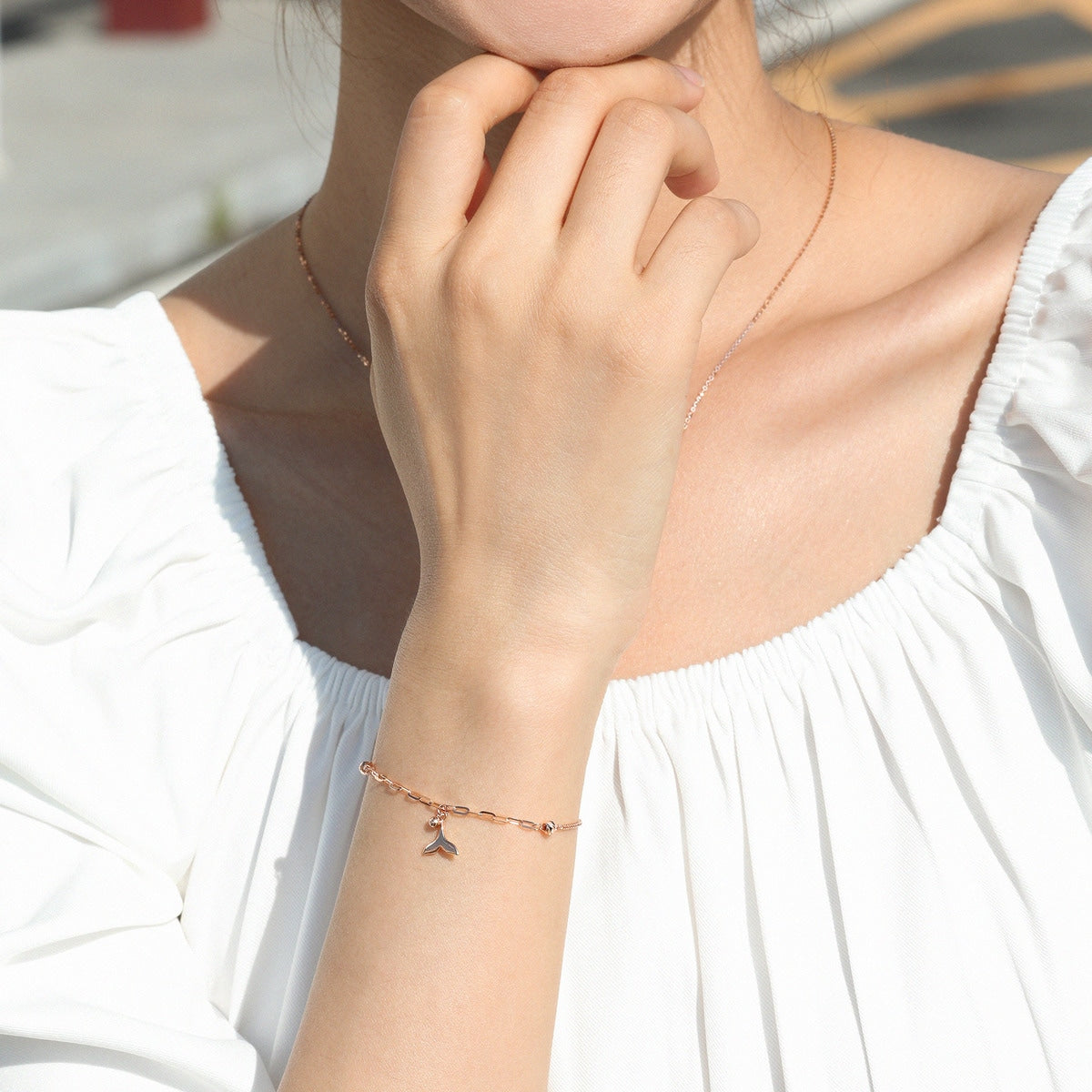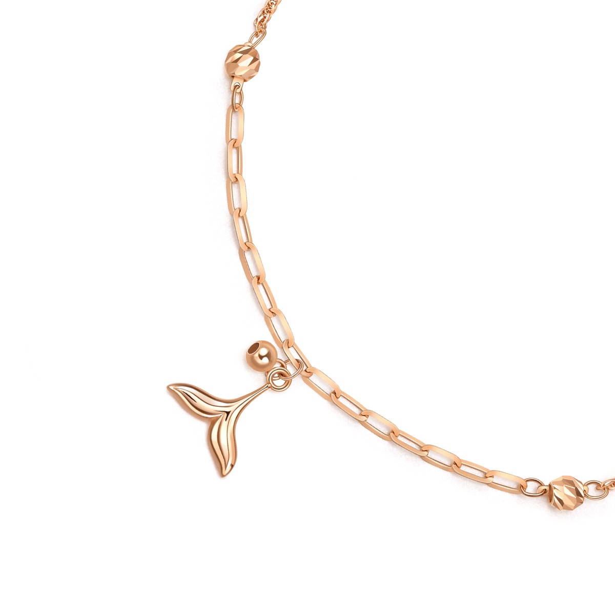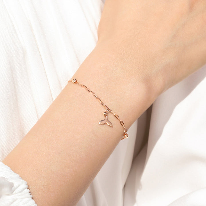 This 18K Rose Gold Bracelet by Chow Sang Sang draws inspiration from the tail of a dolphin, combining spiga and long cable chains. The addition of two tiny engraved beads instantly elevates the subtle elegance of this piece, making it a versatile accessory for any look.