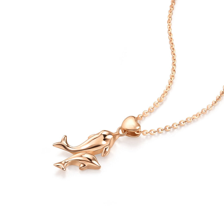 This 18K Rose Gold Necklace by Chow Sang Sang features two dolphins of different sizes, with a three-dimensional heart above the larger dolphin’s head. This design is a sweet and warm graphical interpretation, making it a perfect expression of love and connection.