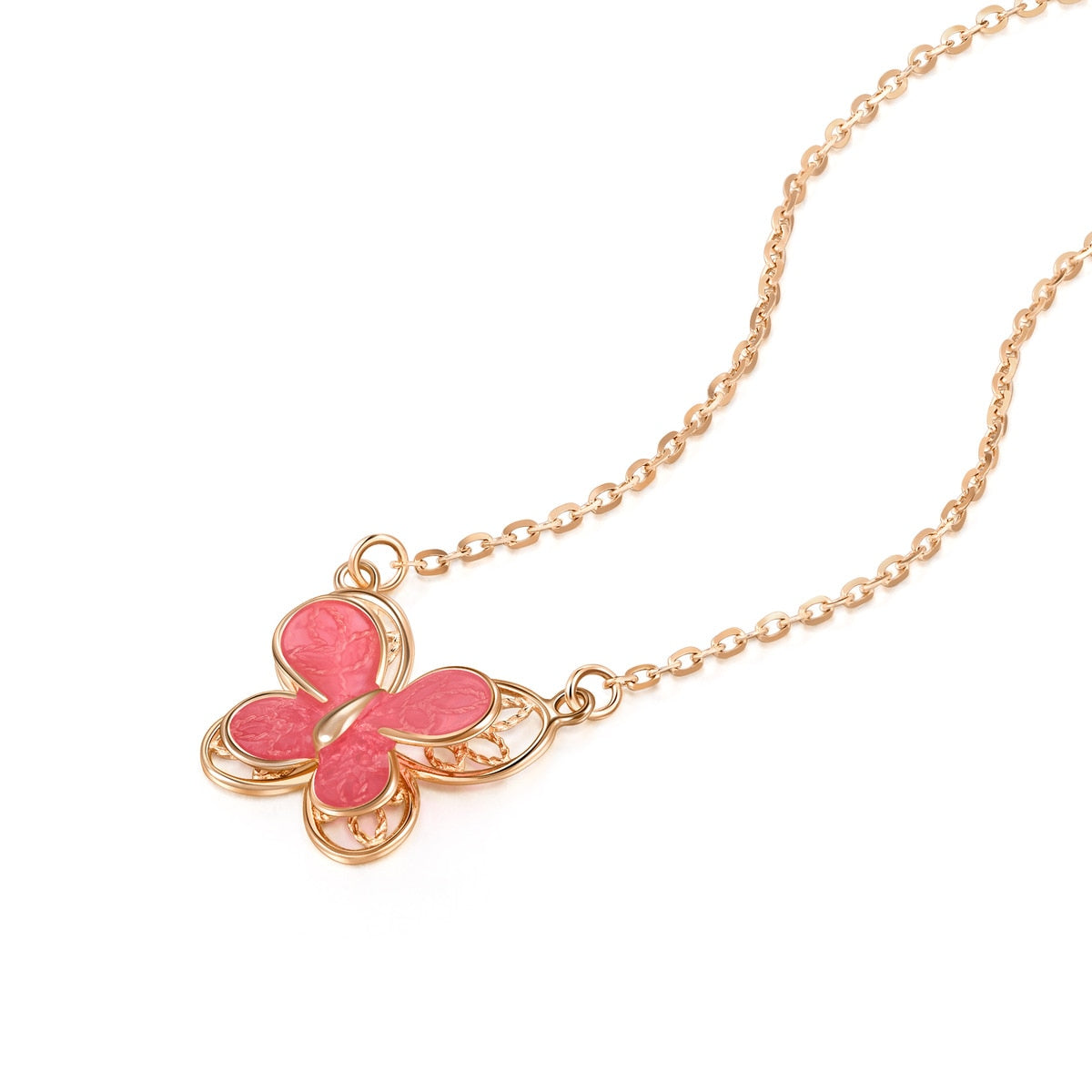 This 18K Rose Gold Butterfly Necklace by Chow Sang Sang features a hollow-carved butterfly design, framed by a vibrant magenta enamel coating. This piece radiates a combination of grace and playfulness, perfect for adding a splash of color to your look.